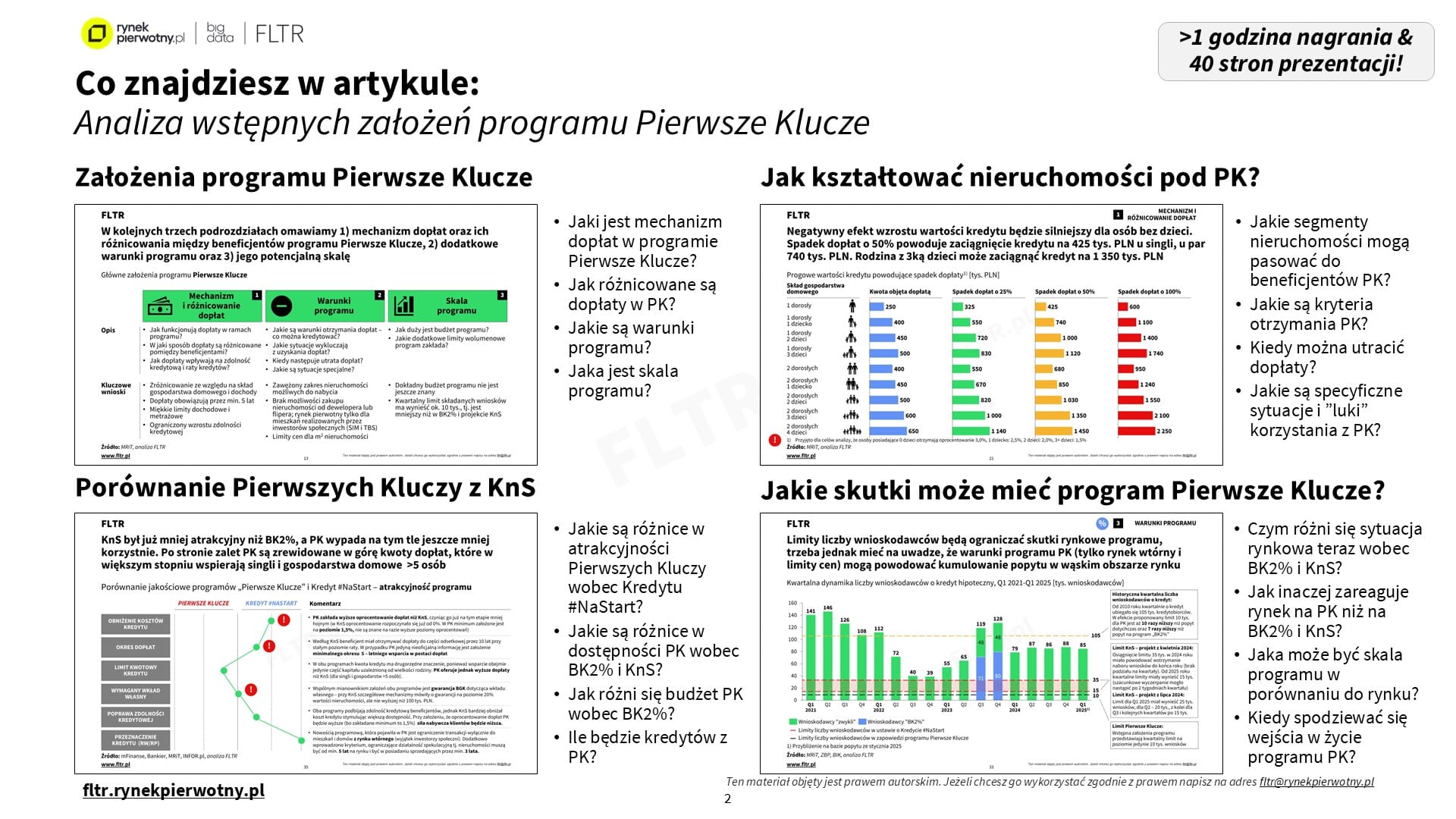 W dniu 13. lutego Minister Rozwoju i Technologii, Krzysztof Paszyk, zaprezentował podczas konferencji założenia nowego programu wspierającego mieszkalnictwo Klucz do Mieszkania, którego jeden z trzech filarów ma stanowić program wsparcia dla kredytobiorców Pierwsze Klucze. Mając świadomość siły wpływu programów dopłat do kredytów na rynek nieruchomości (zwłaszcza z doświadczeń Bezpiecznego Kredytu w 2023 roku) postanowiliśmy zbadać założenia tego programu i ocenić potencjalne jego konsekwencje. W niniejszej analizie wyjaśniamy jak wyglądają wstępne założenia na temat programu dopłat, czym będzie się on różnił wobec swojego niezrealizowanego poprzednika tj. Kredytu #NaStart lub też Bezpiecznego Kredytu, a także jakiego wpływu na rynek nieruchomości możemy się spodziewać po wstępnie zaprezentowanych informacjach.