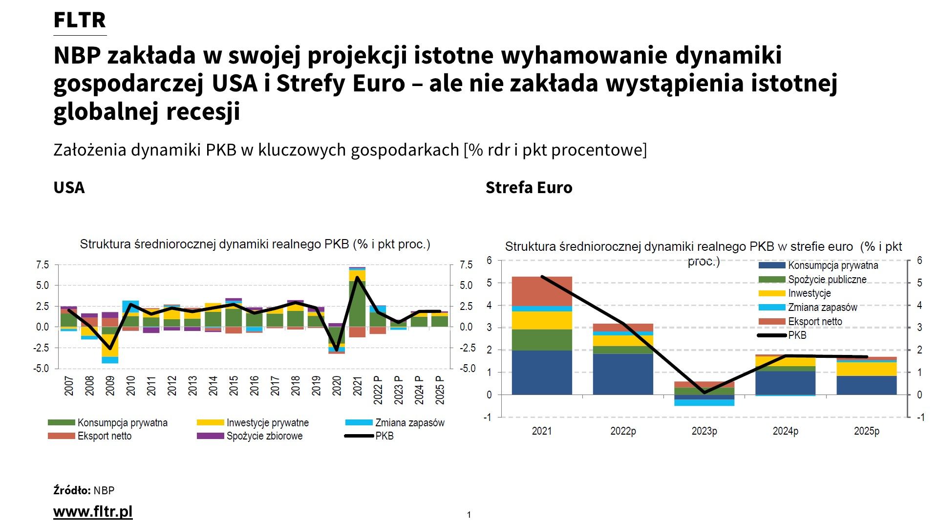 - Istotne spowolnienie dynamiki PKB w 2023 roku, przy czym Q1 2023 z ujemną dynamiką PKB, ale bez technicznej recesji, czyli ujemnej dynamiki przez dwa kwartały z rzędu.