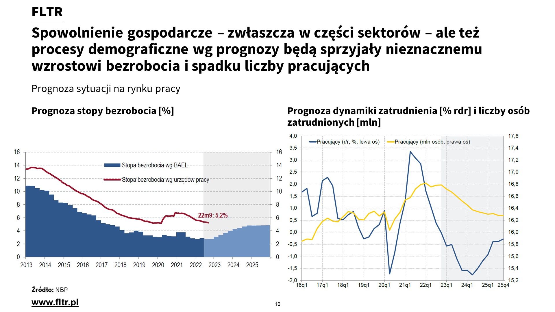 - Wywołane spowolnienie gospodarcze – zwłaszcza w części sektorów takich jak budownictwo – ma wg prognozy sprzyjać spadkowi popytu i nieznacznemu wzrostowi bezrobocia (o ok. 2 punkty procentowe wg BAEL). Wyższe bezrobocie wraz z procesami demograficznymi mają spowodować spadek liczby pracujących, co ma być częściowo łagodzone przez migrację zarobkową m.in. z Ukrainy.