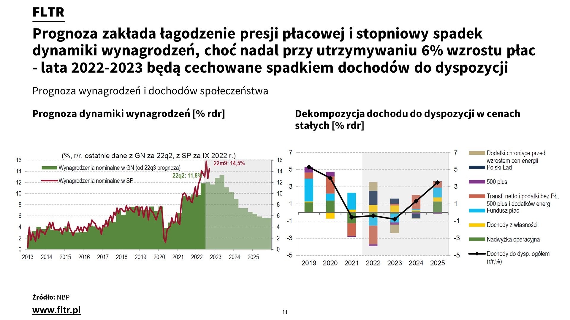- Spadek popytu na pracę, przy łagodzeniu presji inflacyjnej (opisanej poniżej) ma sprzyjać łagodzeniu presji płacowej i stopniowemu spadkowi dynamiki wynagrodzeń. Przy tym prognoza przewiduje nadal utrzymywanie 6% wzrostu płac rdr w okresie projekcji ze względu na demograficzny niedobór siły roboczej.