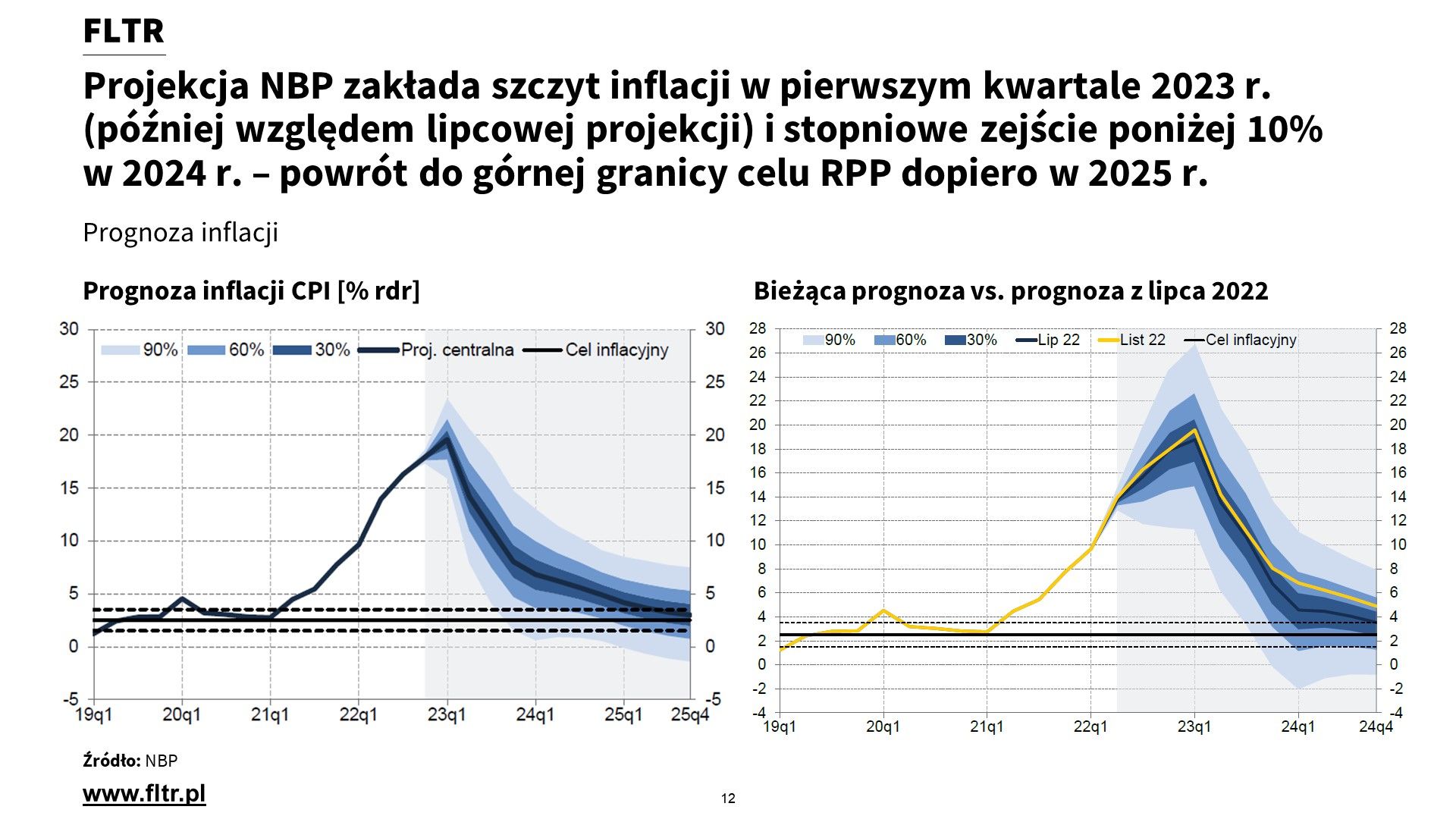 - W zakresie inflacji projekcja NBP zakłada jej szczyt w pierwszym kwartale 2023 r. (jest to później względem lipcowej projekcji) i stopniowe łagodzenie inflacji oraz zejście poniżej 10% inflacji w 2024 r. Powrót do górnej granicy celu RPP ma jednakże nastąpić dopiero w drugiej połowie 2025 r.