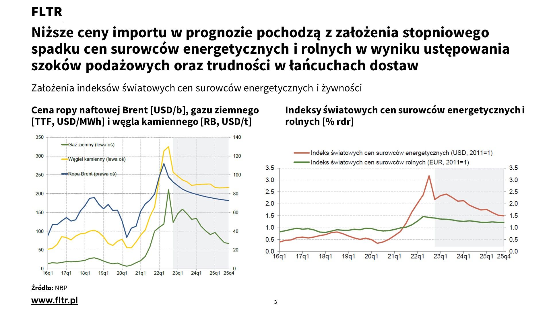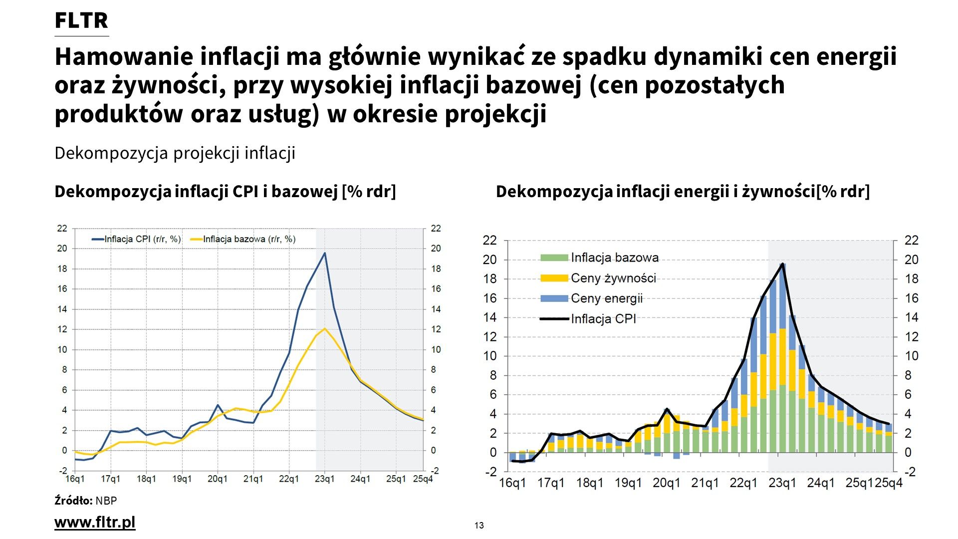 - Hamowanie inflacji ma głównie wynikać ze spadku dynamiki cen energii oraz żywności, tak jak w wyniku czynników zewnętrznych opisanych w założeniach, przy utrzymaniu wysokiej inflacji bazowej (cen pozostałych produktów oraz usług) w okresie projekcji - zasilanych m.in. zakładaną wysoką dynamiką wynagrodzeń.