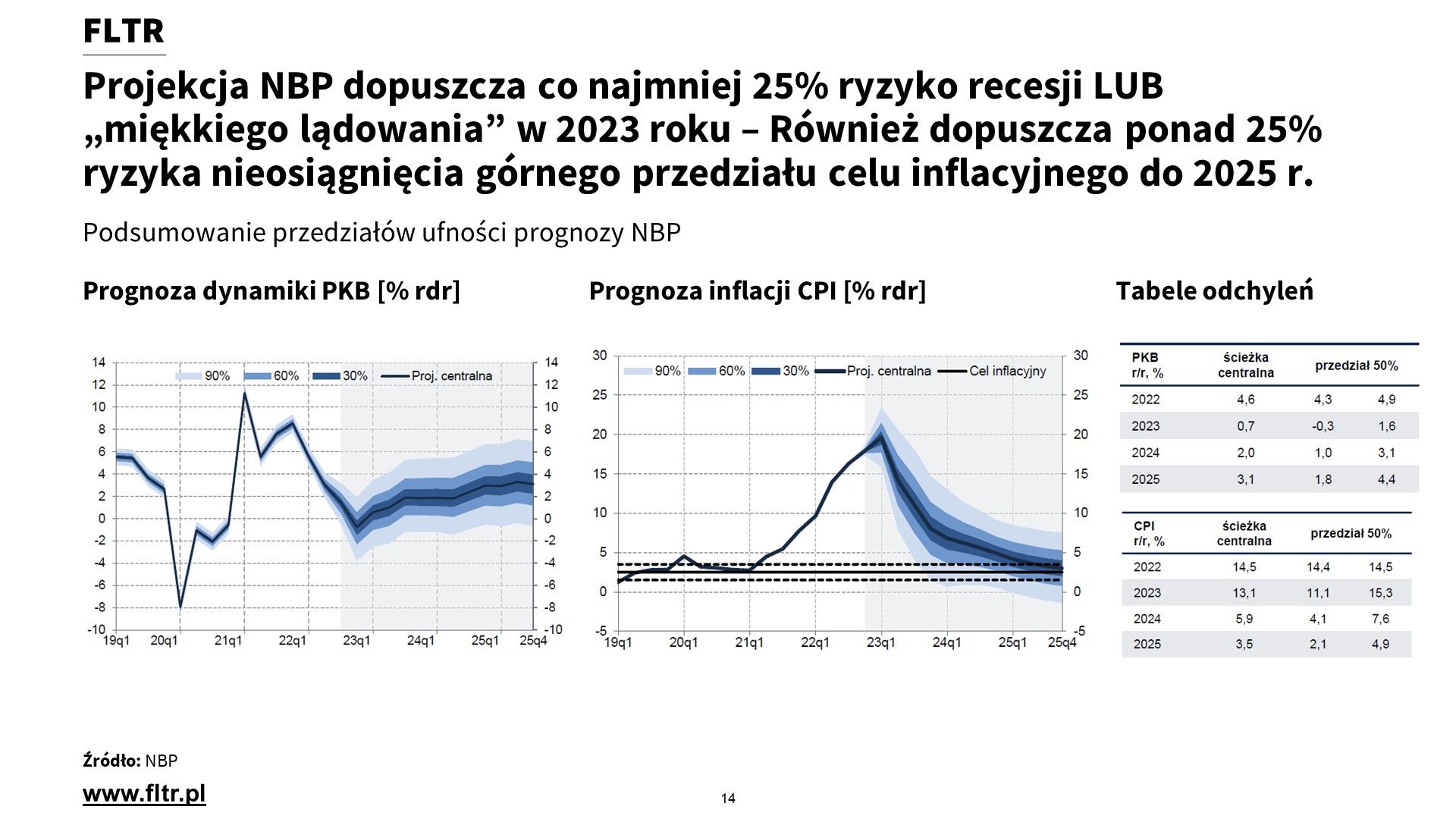 - W zakresie dynamiki PKB projekcja NBP dopuszcza co najmniej 25% ryzyko wystąpienia recesji w 2023 roku. Symetrycznie ponad 25% szans przypisane jest tzw. „miękkiemu lądowaniu” oznaczającemu spowolnienie dynamiki PKB w 2023 roku do "tylko" 1-2% rdr.