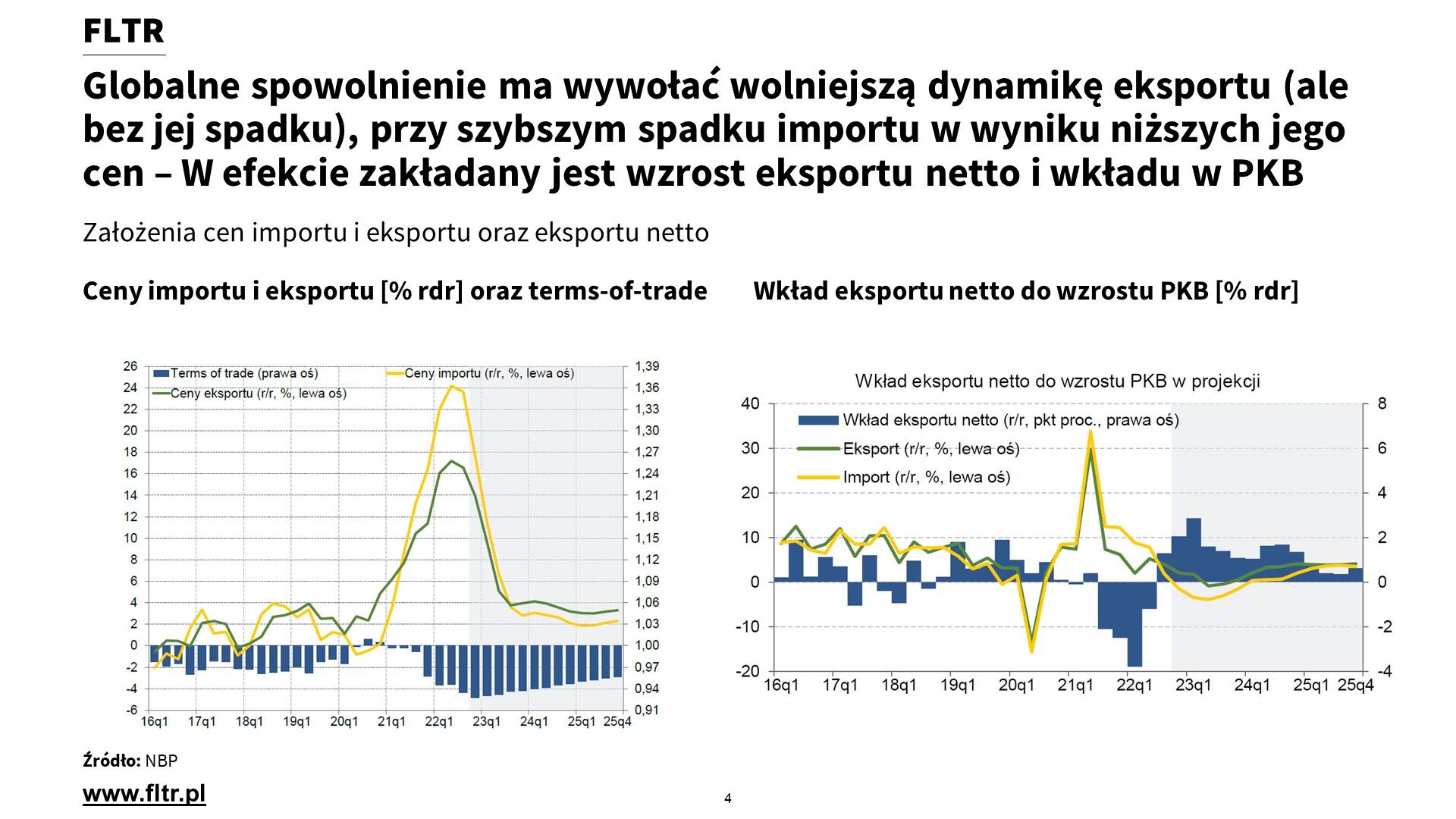 - Wzrost eksportu netto w wyniku szybszego spadku importu (szybko spadające ceny importu) niż spowolnienia eksportu (wywołanego globalnym spowolnieniem) - w efekcie także poprawa bilansu płatniczego kraju.