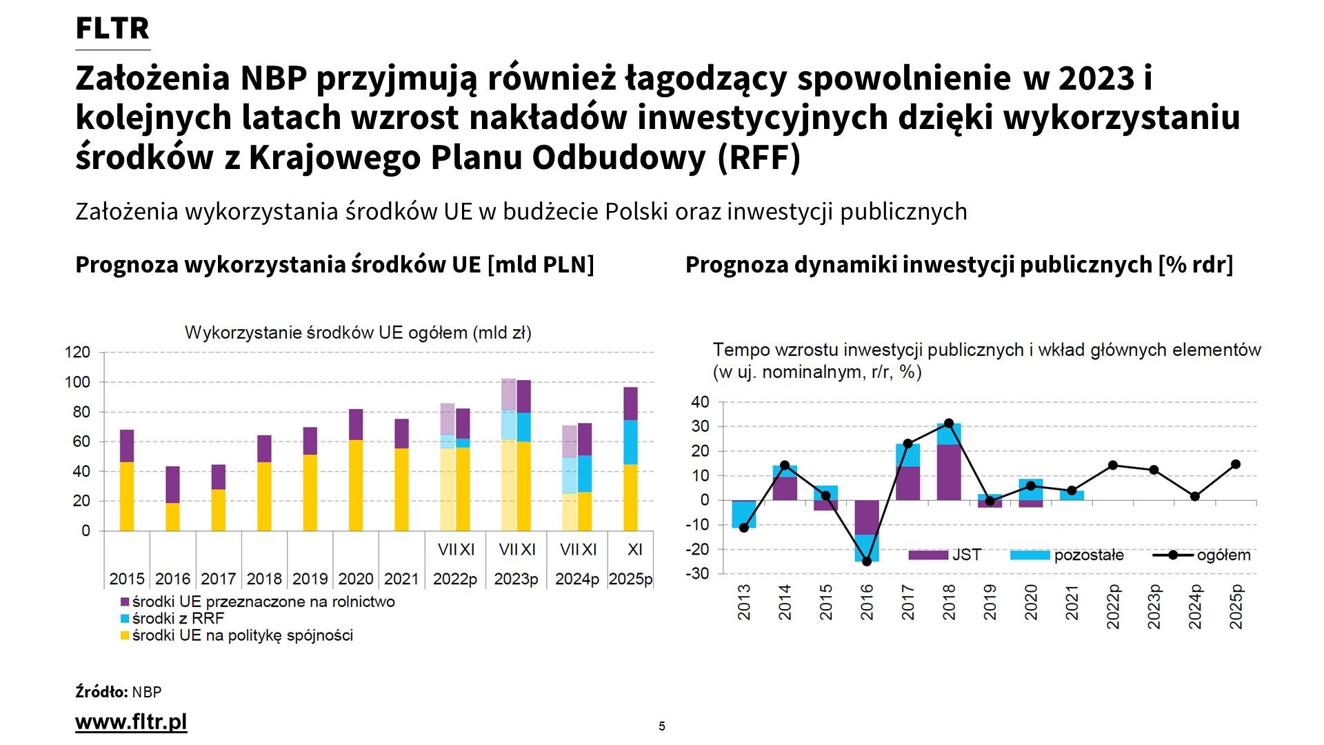 - Utrzymanie wzrostu inwestycji publicznych dzięki wykorzystaniu środków Krajowego Planu Odbudowy (RFF - Recovery and Resilience Facility), zwłaszcza łągodzących spowolnienie w prywatnych inwestycjach (np. budownictwo, maszyny) i dołek gospodarczy w 2023 roku.