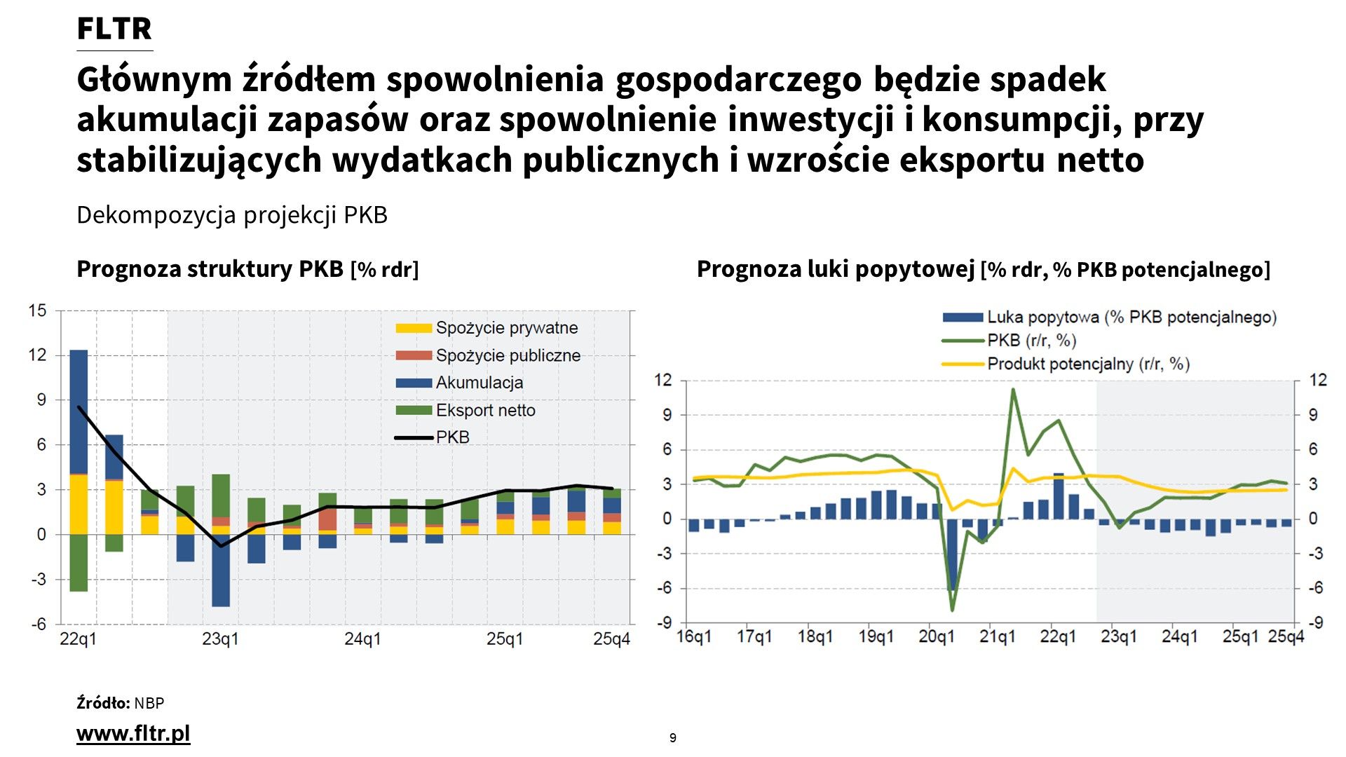 - Wyniki prognoz: Projekcja NBP zakłada tzw. miękkie lądowanie: silne spowolnienie gospodarcze Polski w 2023 roku, głównie ze względu na spadek inwestycji prywatnych i spowolnienie konsumpcji, ale bez recesji dzięki wzrostowi eksportu i inwestycji publicznych. Następnie zakładane jest odbicie gospodarki, napędzane od 2024 r. eksportem netto i konsumpcją, a w dalszej perspektywie inwestycjami prywatnymi. Na tym tle ma nastąpić nieznaczne zmniejszenie presji na rynku pracy z tylko niewielkim wzrostem bezrobocia i spowolnieniem dynamiki wynagrodzeń, przy łagodzeniu spadku dochodów netto przez transfery publiczne. Inflacja ma stopniowo spadać od Q2 2023 osiągając górną granicę celu w 2025. Spadek inflacji ma jednakże nastąpić głównie w wyniku czynników zewnętrznych - spadku cen energii i żywności - a inflacja bazowa ma pozostawać na wysokim poziomie w okresie projekcji, napędzana m.in. wysoką dynamiką wynagrodzeń
