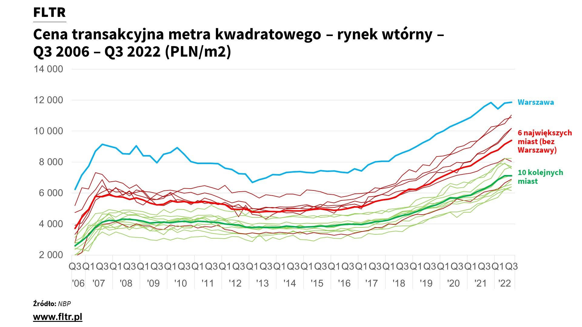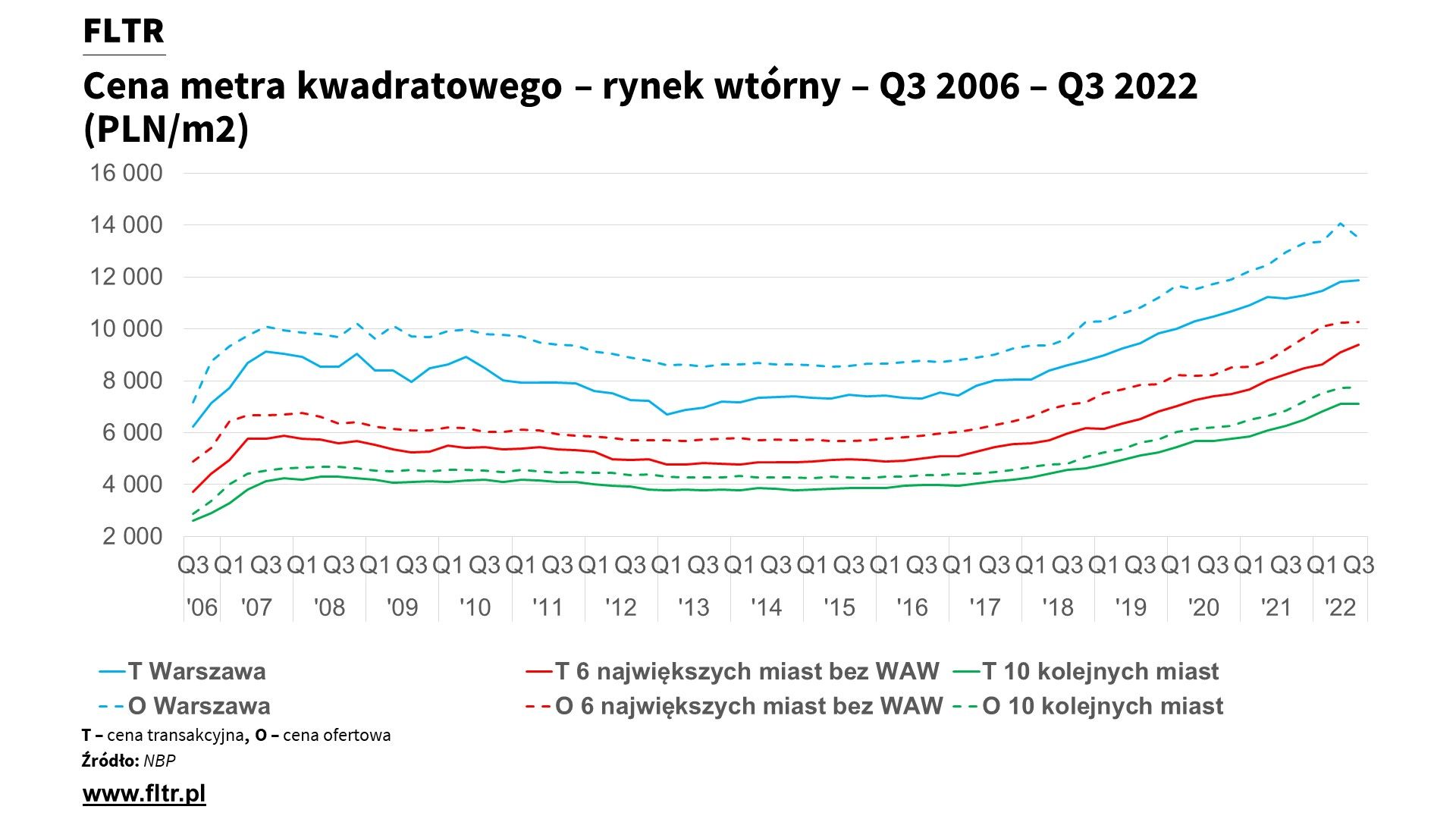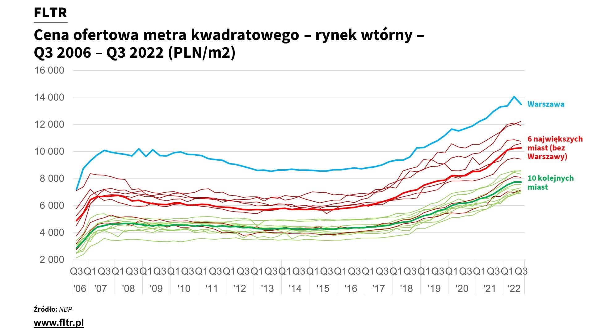 Najwyższe ceny nominalne na rynku wtórnym zostały odnotowane w Warszawie, wynosząc 13.496 PLN/m2 (spadek o 4,0% vs. Q2 z poziomu 14.061 PLN/m2), a najniższe w Kielcach na poziomie 6.921 PLN/m2 (wzrost 1,7%). Przeciętna dla 6 największych miast poza Warszawą wyniosła 10.269 PLN/m2 (nieznaczny wzrost o 0,4%), a średnia ważona dla pozostałych 10 mniejszych miast wyniosła 7.744 PLN/m2 (równie nieznaczny wzrost o 0,1%).