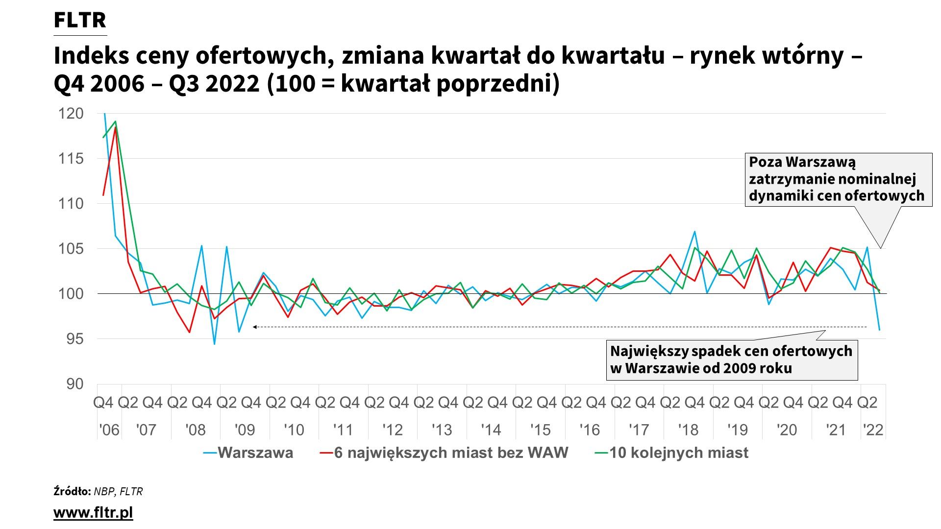 Spowolnienie cen ofertowych nastąpiło we wszystkich geografiach - w Warszawie oraz większych i mniejszych miastach wojewódzkich, chociaż z pewnymi wyjątkami. Ujemna dynamika w Warszawie była najniższą od przełomu 2008 i 2009 roku. W miastach wojewódzkich spadek dynamiki do zera ze wzrostów rzędu 5% kw/kw w 2021 r. jest silną korektą zbliżoną do efektów COVID w 2020, ale nie może jednakże być jeszcze potraktowany jako silną korektę spadkową.