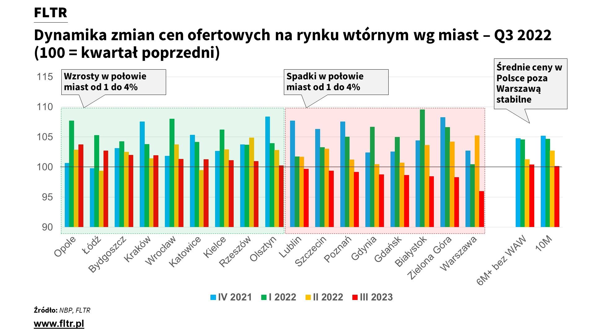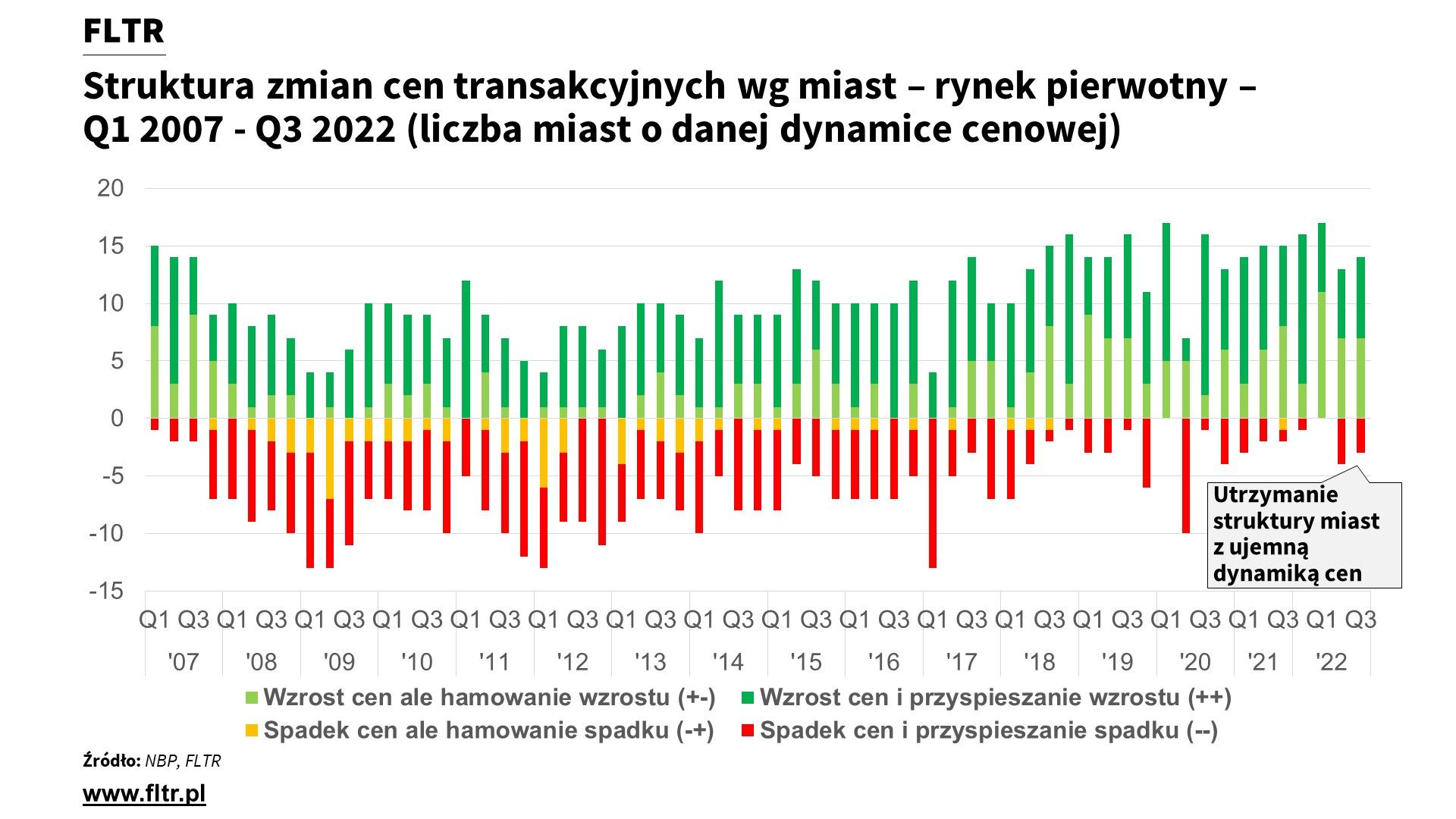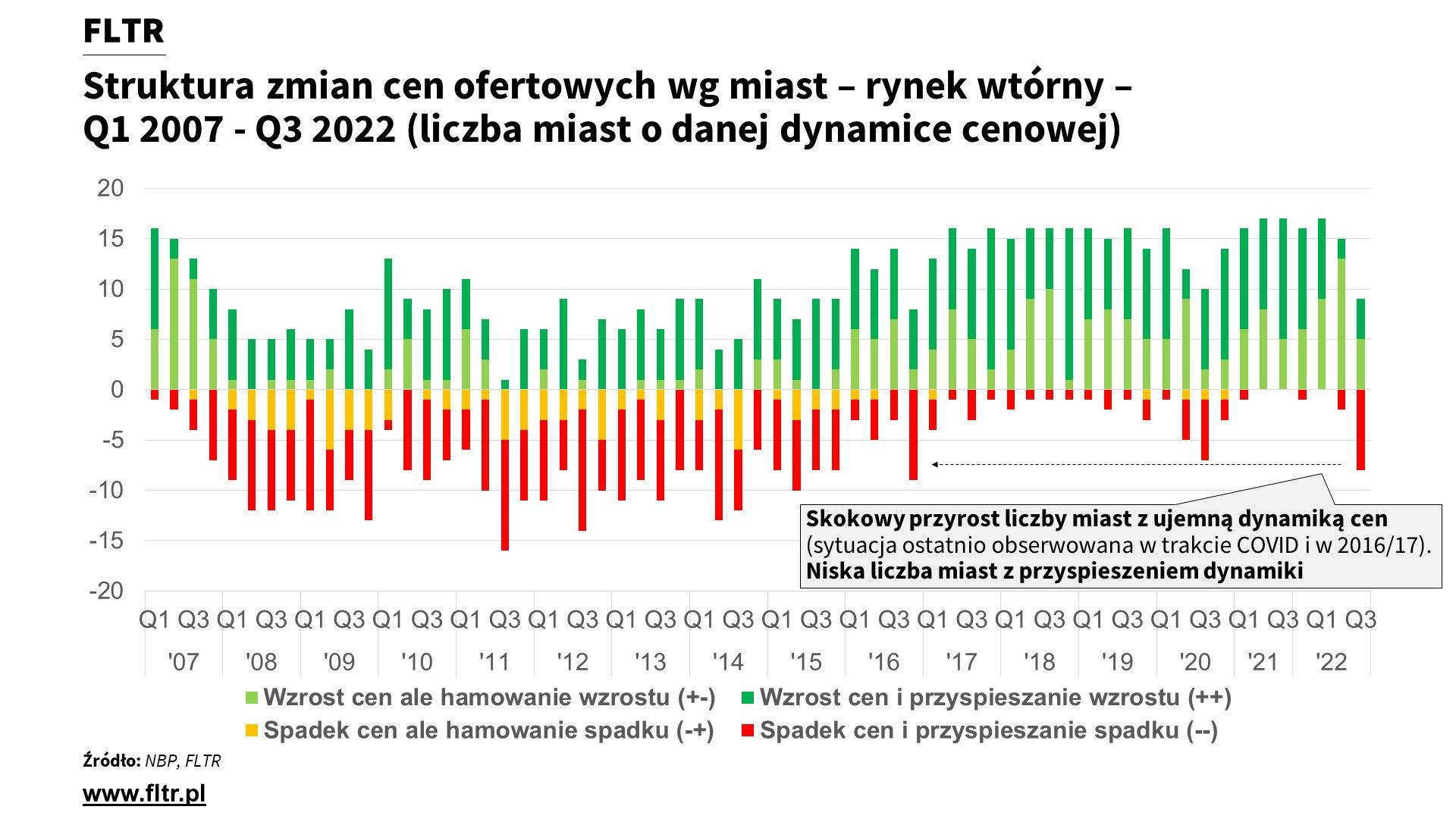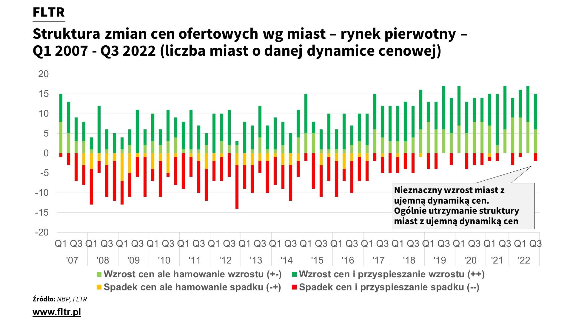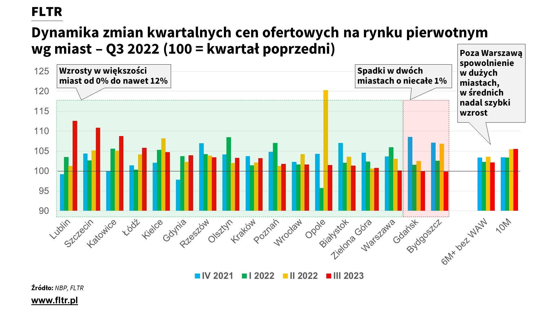 W skali struktury zmian cen nie nastąpiły w Q3 2022 istotne zmiany - w dwóch miastach nastąpiły pomijalne spadki średnich cen ofertowych (Gdańsk i Bydgoszcz o ok. 0,1-0,2%), w pozostałych miastach wzrosty cen były utrzymane - w sześciu miastach nastąpiły były one wolniejsze niż w Q2 (Białystok, Kielce, Opole, Rzeszów, Warszawa, Wrocław), a w kolejnych 9 była ona szybsza (Gdynia, Katowice, Kraków, Lublin, Łódź, Olsztyn, Poznań, Szczecin, Zielona Góra). Zwłaszcza mniejsze miasta miały ponadprzeciętnie wysoką dynamiką cen (Lublin 12% kw/kw, Szczecin 11% kw/kw, Katowice 9% kw/kw) mogąc wpływać na zawyżanie ogólnych agregatów cenowych.