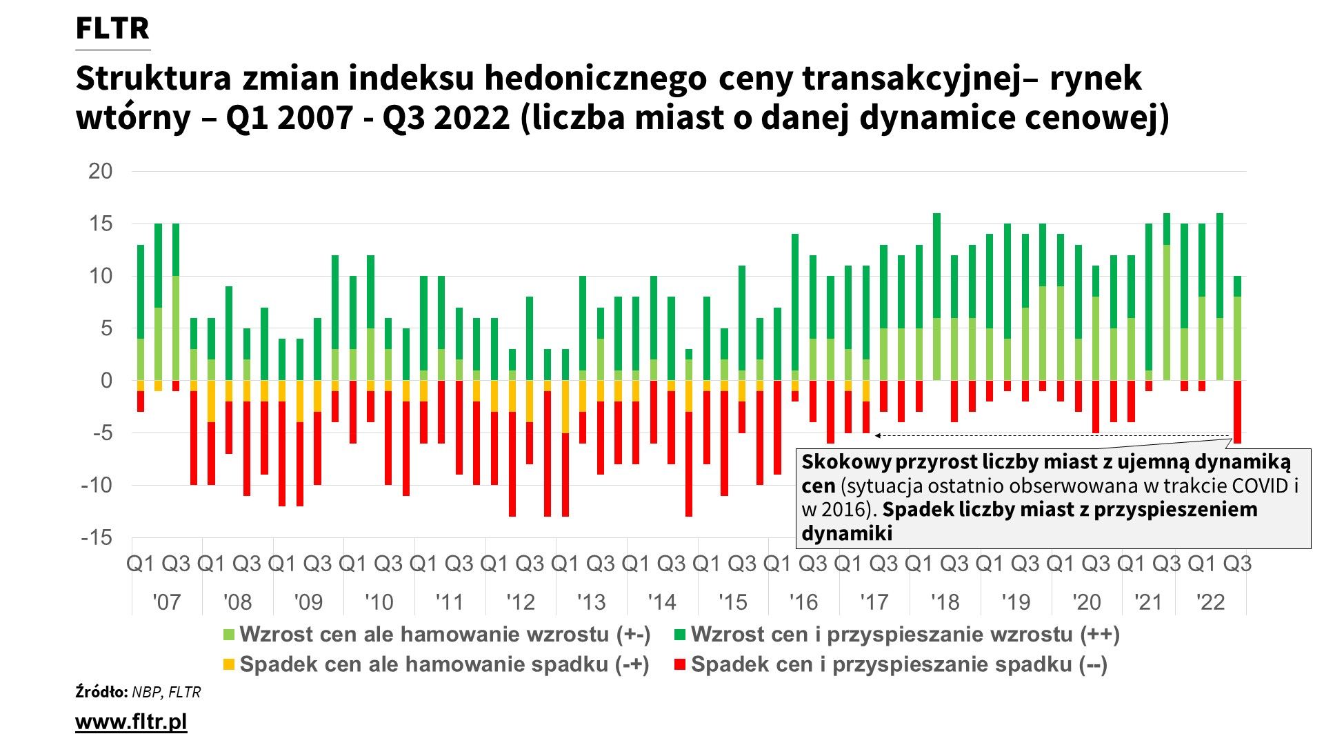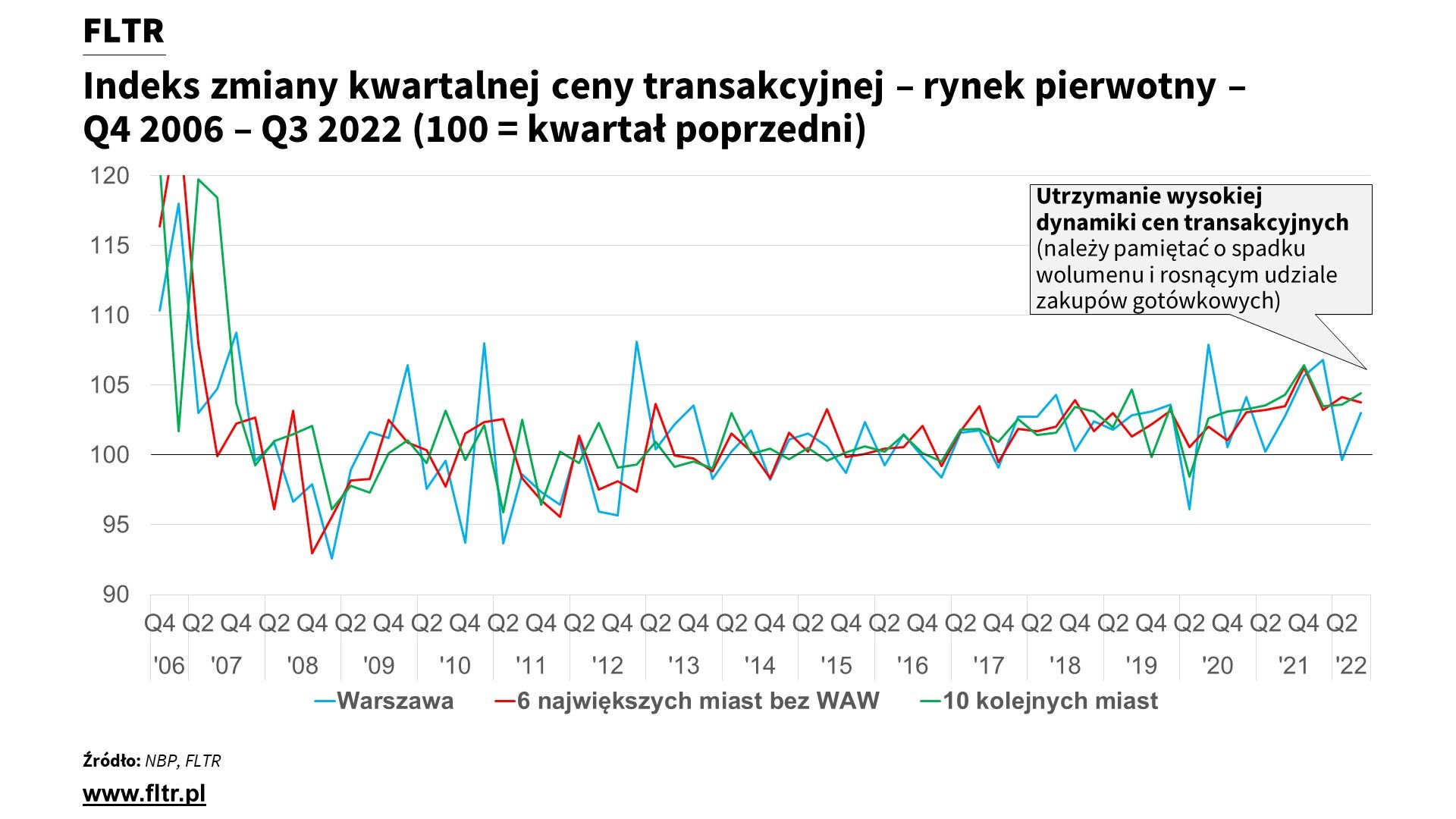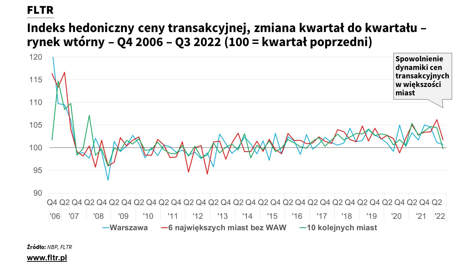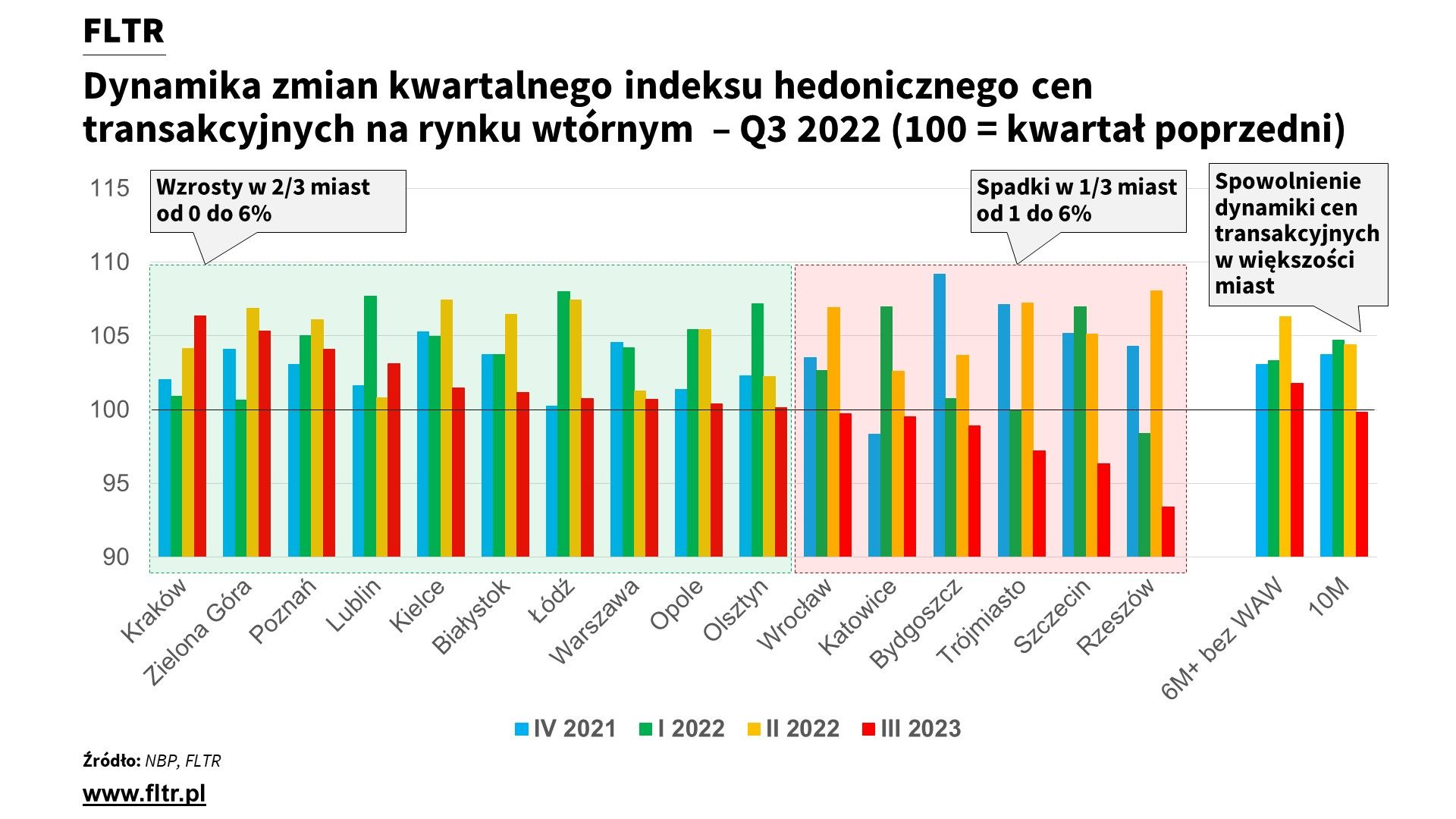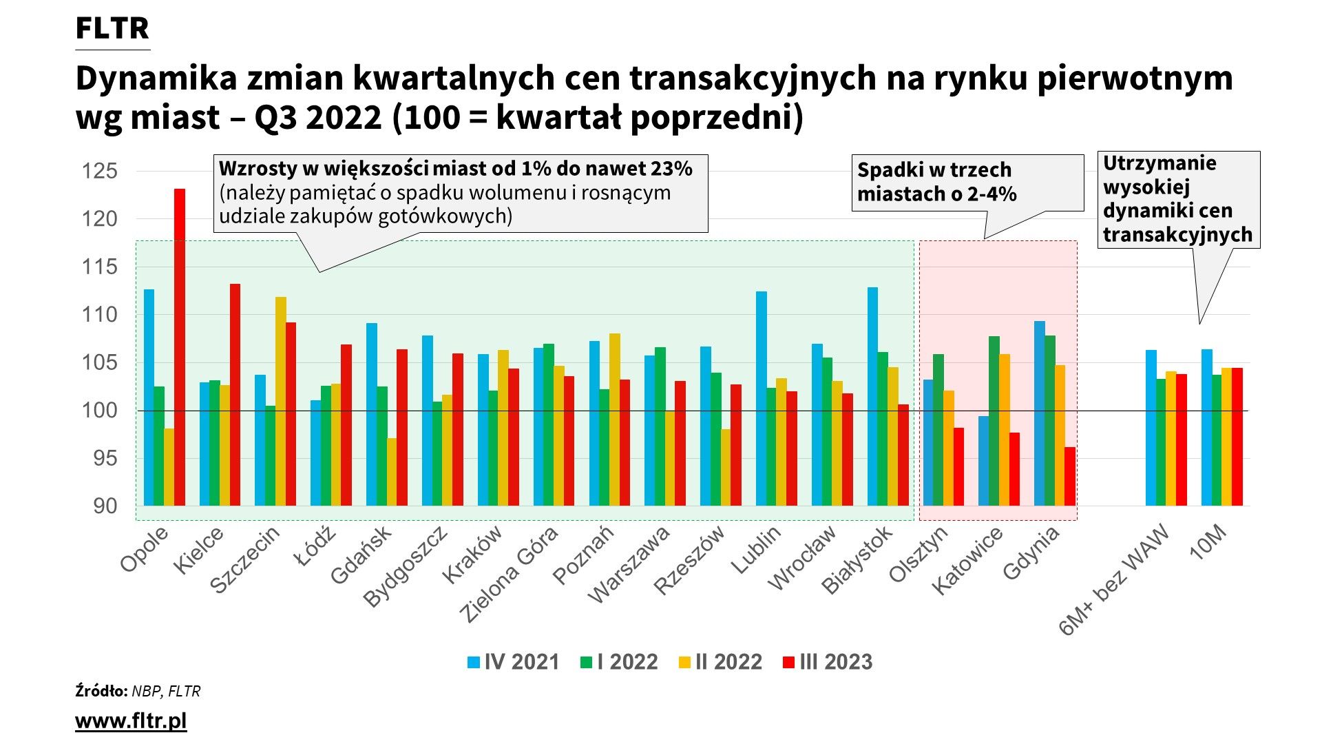 Zjawisko hamowania cen transakcyjnych było jeszcze szersze, niż w przypadku cen ofertowych. W 6 miastach odnotowano spadki indeksu hedonicznego (Bydgoszcz, Trójmiasto, Katowice, Rzeszów, Szczecin, Wrocław) - w szczególności spadki miały miejsce w większych miastach, które w ostatnim roku cieszyły się wysoką dynamiką cenową (np. Rzeszów -6% kw/kw, Szczecin -4% kw/kw, Trójmiasto -3% kw/kw). Z kolei w 8 miastach indeks hedoniczny był dodatni, ale ulegał hamowaniu (Białystok, Kielce, Łódź, Olsztyn, Opole, Poznań, Warszawa, Zielona Góra). Miastami w których dynamika cenowa była dodatnia i szybsza niż w Q2 były Kraków (z najszybszym wzrostem na poziomie 6% kw/kw) oraz Lublin (wzrost o 3% kw/kw).