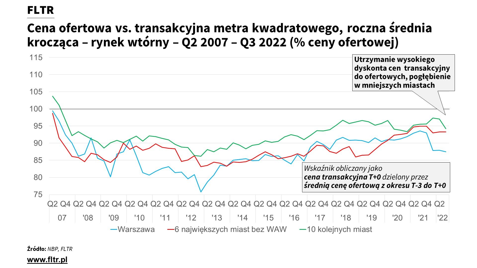 Wreszcie, średnie dyskonto ceny transakcyjnej (nominalnej) wobec średniej kroczącej cen ofertowych utrzymało się na wysokim poziomie we wszystkich miastach. Najmocniej pogłębiło się ono w najmniejszych miastach, do poziomu zbliżonego do okresu 2020 roku. W Warszawie wskaźnik ten był na niskim poziomie odnotowywanym ostatnio w 2016 roku. Relatywnie najmniejsze dyskonto odnotowywano w większych miastach wojewódzkich.