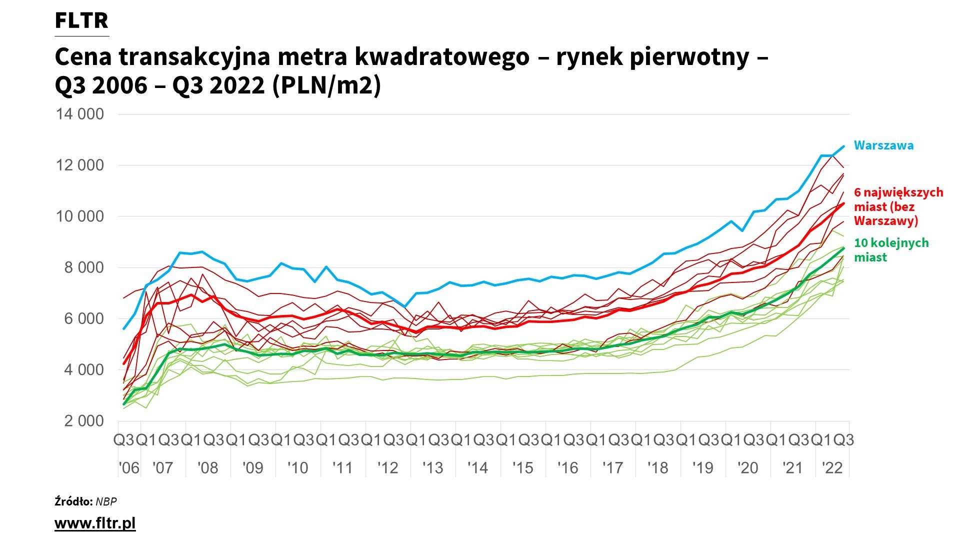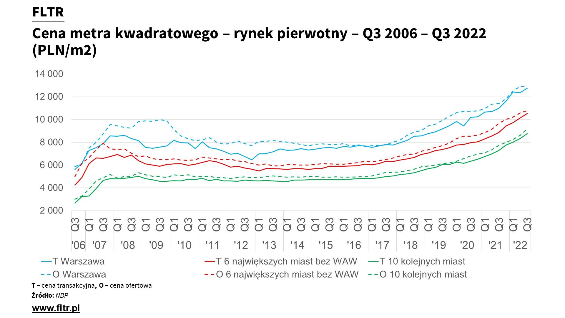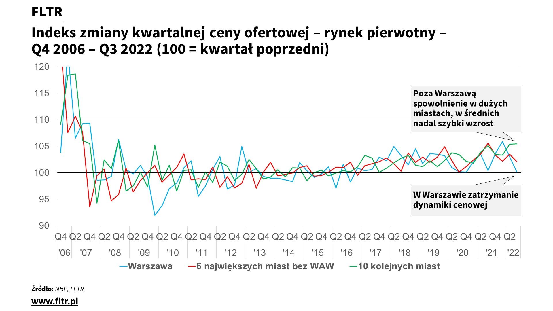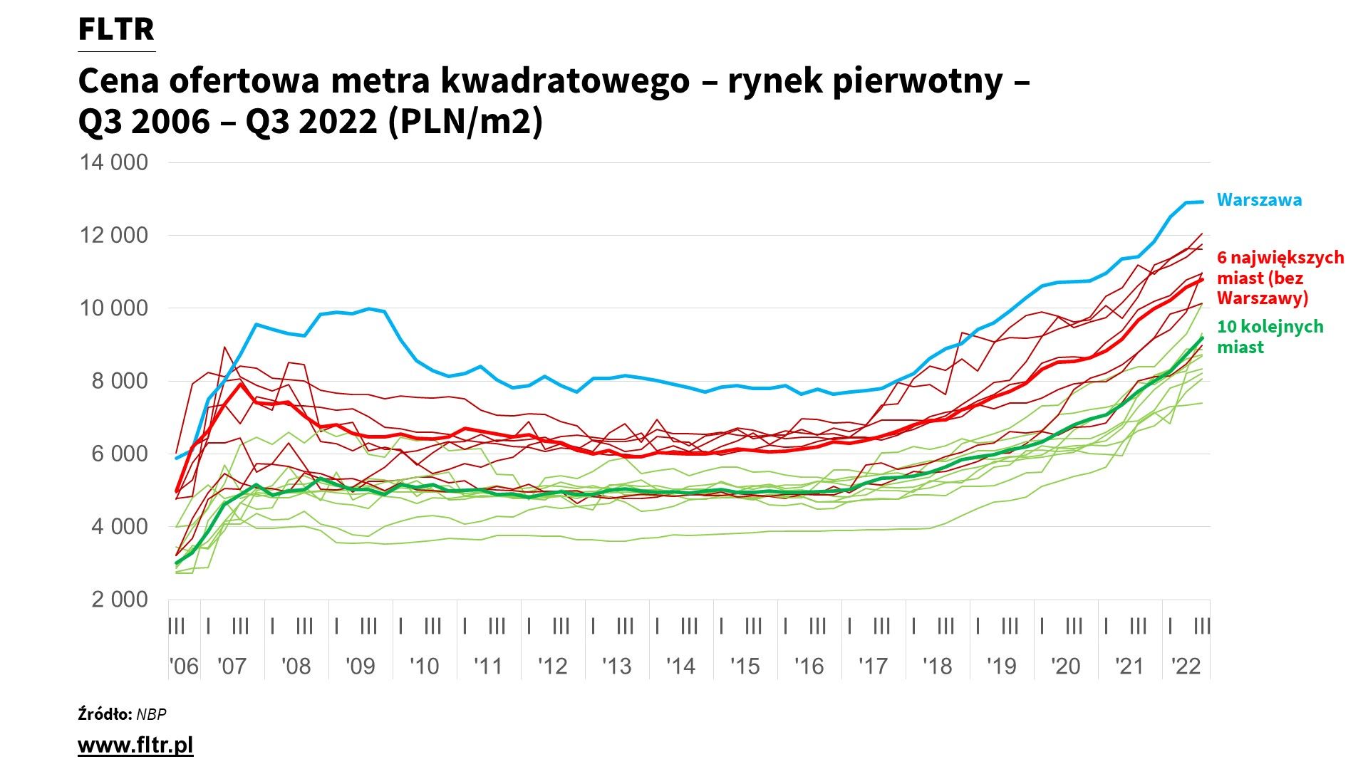 Oferta na rynku pierwotnym cechowała się kontynuacją trendów wzrostowych w większości miast, bez obserwacji istotnych tendencji spadkowych, choć można było zauważyć spowolnienie w niektórych z miast. Najwyższe ceny nominalne zostały odnotowane w Warszawie, osiągając pułap 12.911 PLN/m2 (wzrost o 0,1% vs. Q2), a najniższe w Zielonej Górze na poziomie 7.390 PLN/m2 (wzrost 0,7%). Przeciętna dla 6 największych miast poza Warszawą wyniosła 10.796 PLN/m2 (wzrost o 2,1%), a średnia ważona dla pozostałych 10 mniejszych miast wyniosła 9.184 PLN/m2 (wzrost o 5,5%).