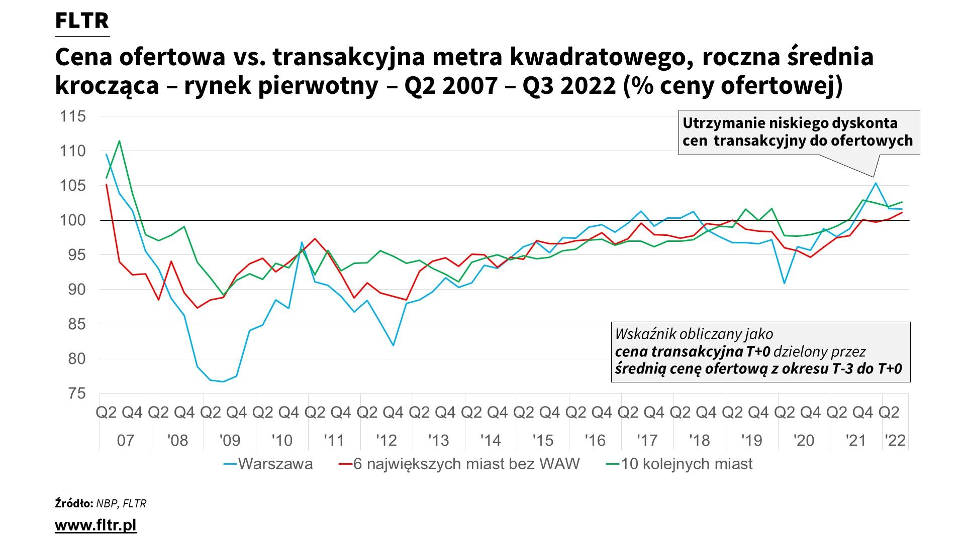 Wskaźnik średniego dyskonta ceny transakcyjnej wobec średniej kroczącej cen ofertowych może potwierdzać otoczenie popytowe w Q3 2022. Mimo istotnego spadku wolumenu sprzedaży przeciętne ceny transakcyjne przewyższały średnie ceny ofertowe z ostatniego roku o średnio 1-3%, przy utrzymaniu tendencji wzrostowej tego wskaźnika. Może to potwierdzać (przed poznaniem szczegółowych danych wolumenowych) o fakcie zawierania większości transakcji w wybranych segmentach cenowych o podwyższonej średniej cenie (małe lokale, lokale w podwyższonym standardzie. Wskaźnik ten utrzymuje się od drugiej połowy 2021 roku na poziomie powyżej 100%.
