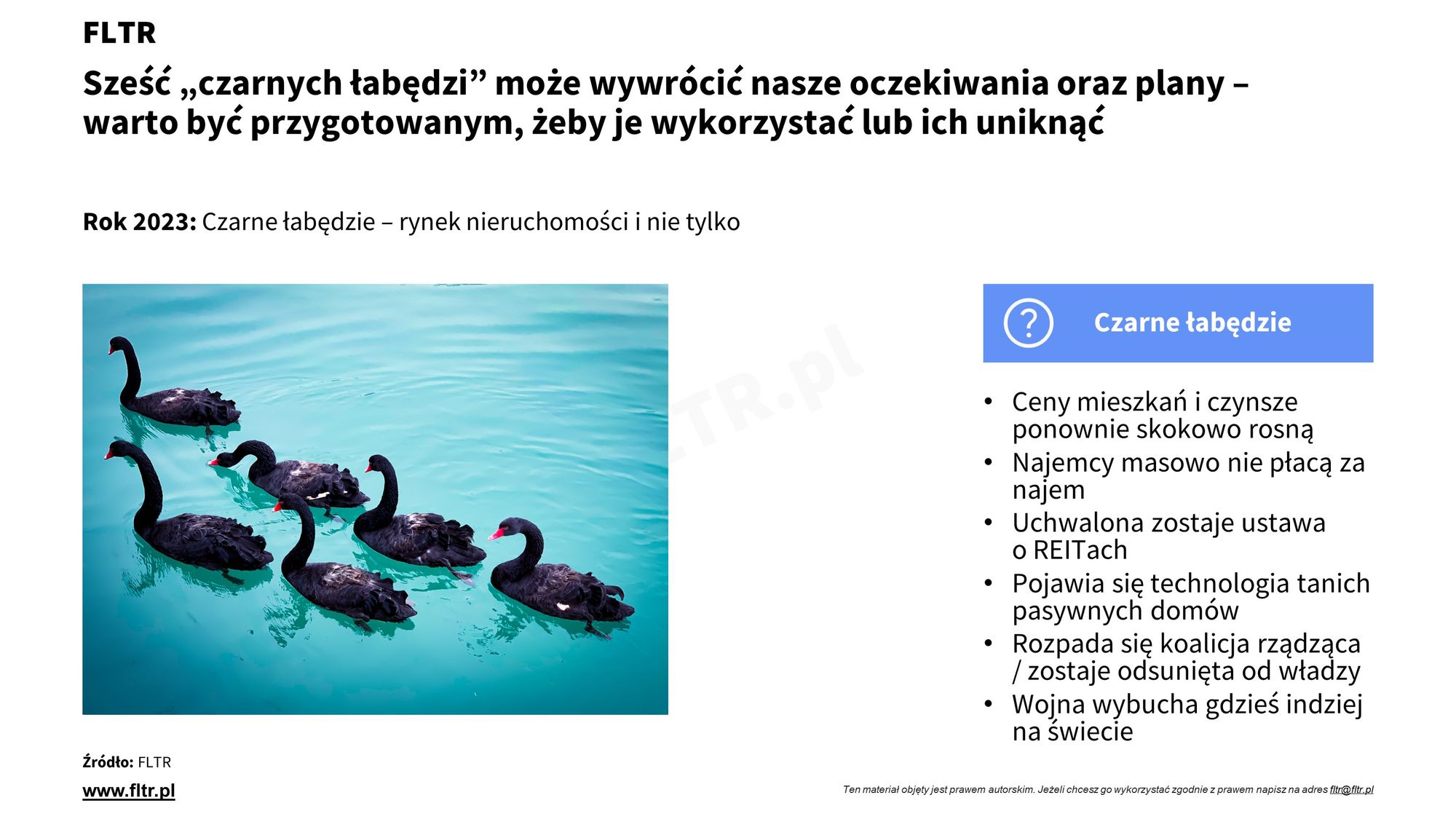 - Czarne łabędzie: Sześć "czarnych łabędzi" obejmuje: nowe szoki cenowe, masowe problemy z płatnościami czynszów, uchwalenie ustawy o REITach, przełom w technologii tanich pasywnych domów, polityczne "trzęsienie ziemi" w Polsce oraz wybuch kolejnej wojny