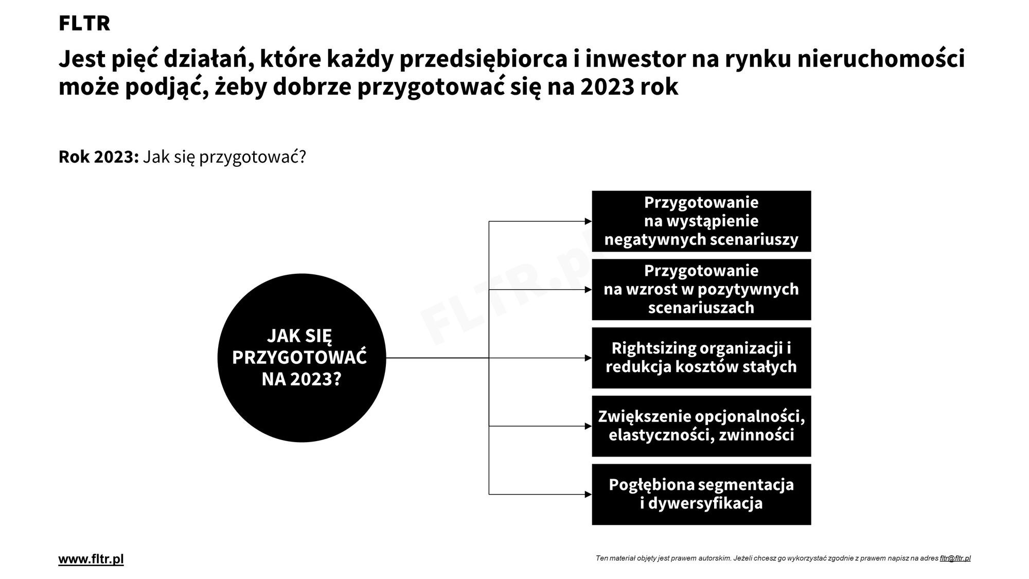 - Jak się przygotować? Przedsiębiorca i inwestor przygotowując się na 2023 rok powinien: przygotować się na wystąpienie zarówno negatywnych dla niego scenariuszy, jak i wykorzystanie tych pozytywnych, przeprowadzić rightsizing organizacji, zwiększyć opcjonalność, elastyczność i zwinność swojego biznesu oraz pogłębić segmentację i dywersyfikację swojej działalności