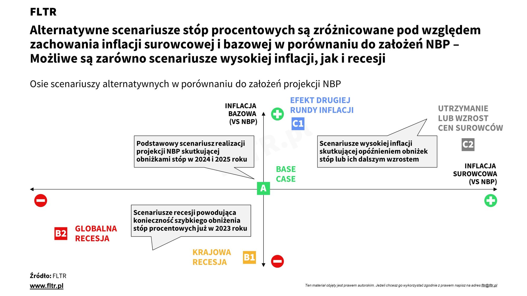 - Perspektywa obniżek stóp procentowych oddala się - ze względu na wyższą niż przewidywano inflację w roku 2023 nie następują ani obniżki stóp procentowych, ani nawet nie pojawia się perspektywa do szybkiego ich cięcia. Ze względu na pro-inflacyjne szoki RPP może być zmuszona do kolejnych podwyżek stóp procentowych na przestrzeni 2023.