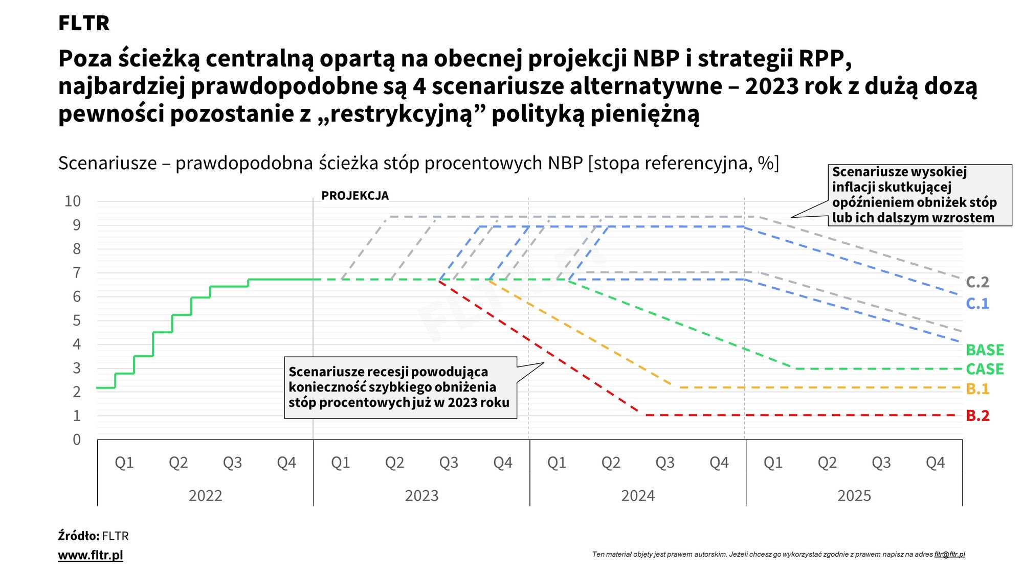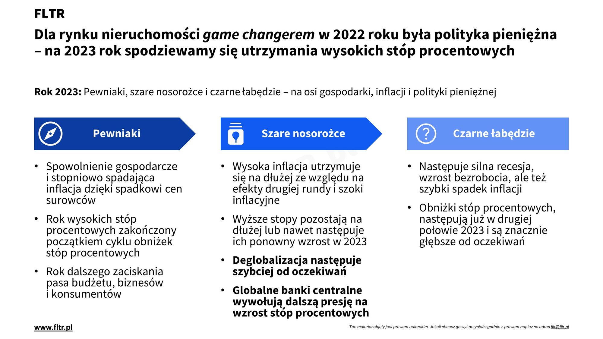 - Rok wysokich stóp procentowych - mimo spowolnienia gospodarczego i spadku inflacji nie spodziewamy istotnego spadku kosztów finansowych i poprawy zdolności kredytowej w 2023 roku. Jeżeli nawet inflacja CPI spadnie poniżej dwucyfrowego poziomu dając RPP uzasadnienie do złagodzenia polityki pieniężnej, to do końca roku co najwyżej zobaczymy dopiero początek cyklu obniżek stóp lub nawet tylko jego zapowiedź