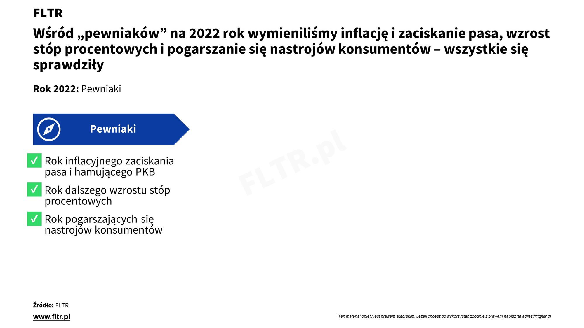 Wszystkie "pewniaki" okazały się przez nas trafione - rosnąca inflacja (nawet przed wybuchem wojny w Ukrainie), spowolnienie PKB, wzrost stóp procentowych i pogorszenie nastrojów konsumentów faktycznie miały miejsce. Zwłaszcza w obszarze stóp procentowych było dla niektórych zaskakujące. Nie będziemy ich komentować w szczegółach.