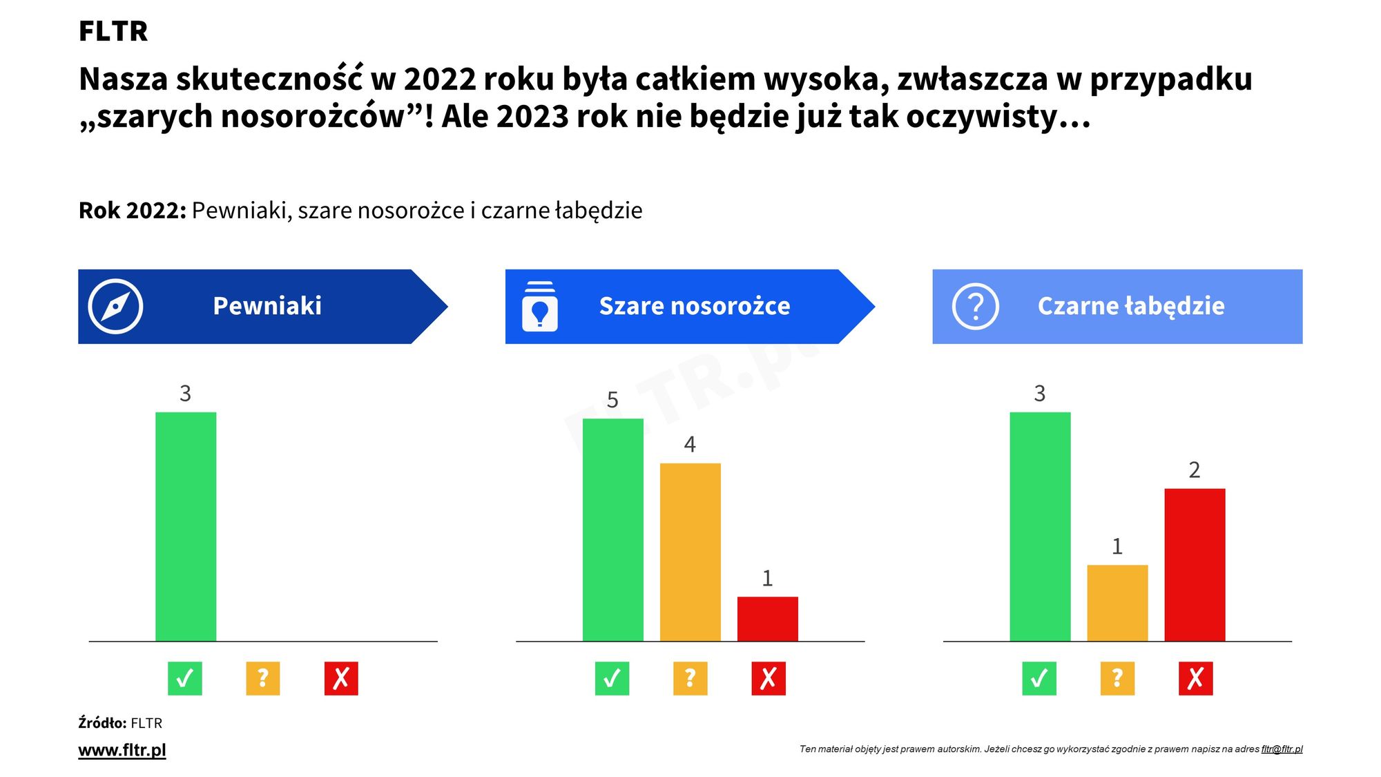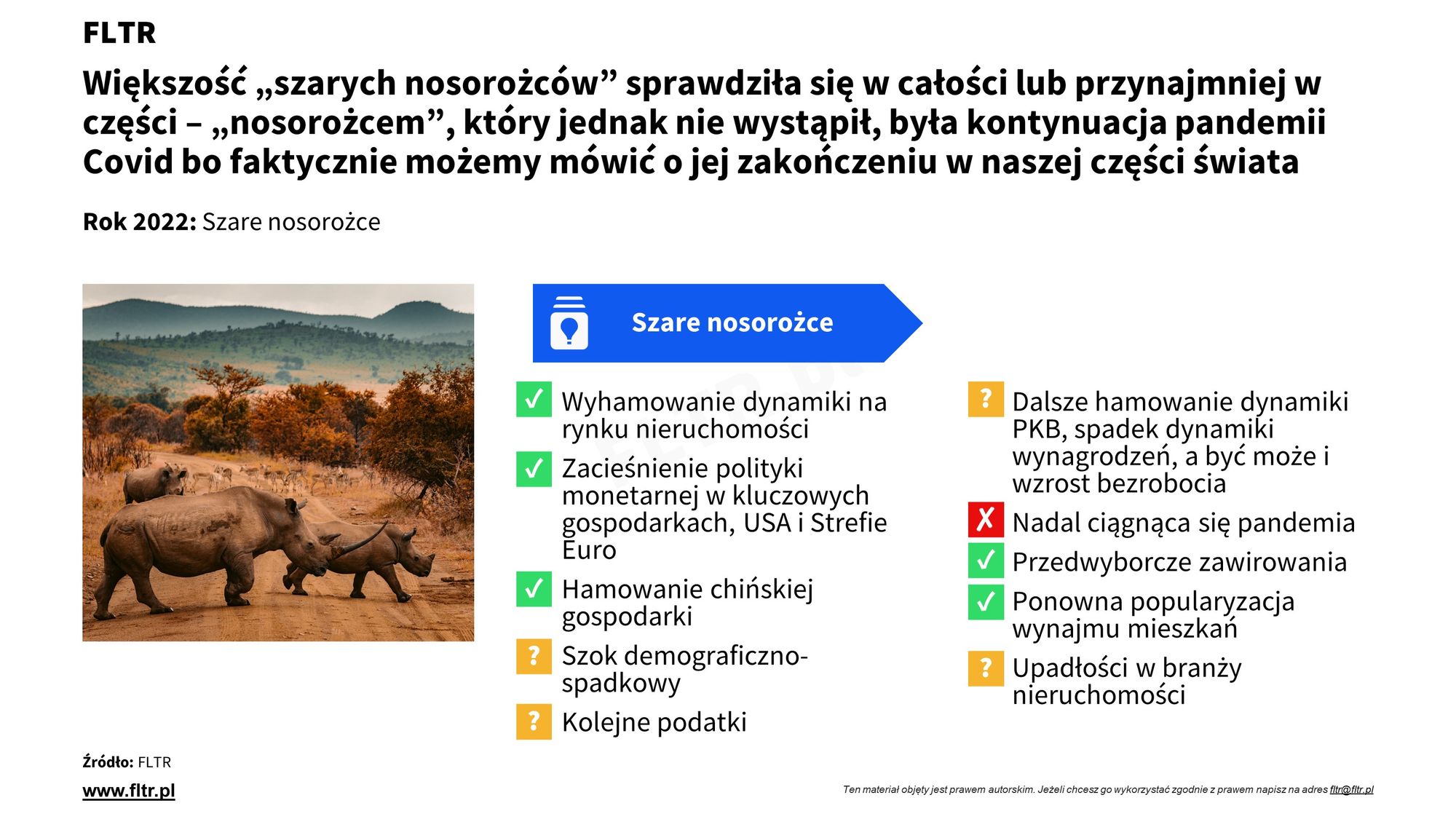Tylko z jednym "okazem" szarego nosorożca nie mieliśmy racji - mianowicie w naszej części świata można mówić o zakończeniu pandemii Covid w wydaniu jakie znamy z 2020 i 2021 roku - nie spełniły się obawy o gospodarcze skutki ograniczeń covidowych. Oczywiście oficjalnie pandemia się nie zakończyła, a zwłaszcza w Chinach nadal wpływa ona na aktywność gospodarczą, ale jednak ten czynnik w coraz mniejszym stopniu rzutuje na polskie PKB czy inflację.