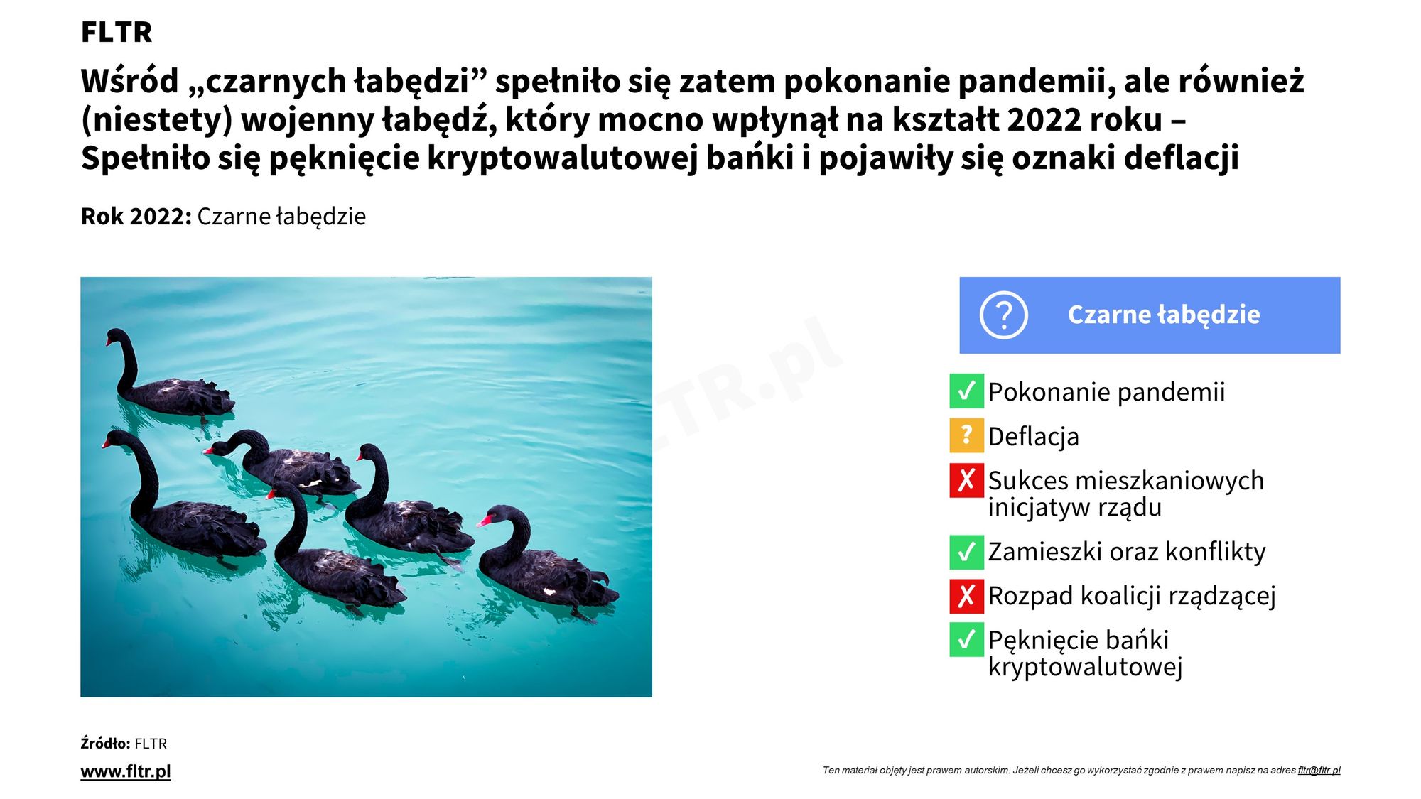 Trafnie zidentyfikowaliśmy trzy z sześciu "czarnych łabędzi". To właśnie "pokonanie pandemii" okazało się trafionym oczekiwaniem. Niestety mieliśmy też rację co do nasilania się konfliktów w 2022 roku - uwidocznionym w "gorącym konflikcie" w postaci ataku Rosji na Ukrainę, ale też konfliktów, napięć granicznych i zamieszek (wymieniając tylko Kazachstan, Sri Lanka, Azerbejdżan-Górny Karabach, czy Serbia-Kosowo) nasilanych między innymi przez światową sytuację gospodarczą, ale zwłaszcza "zimnej wojny" Chin z USA. Pękła też bańka kryptowalutowa, skutkując upadkiem szeregu istotnych podmiotów w sektorze o niekoniecznie najlepszej wiarygodności, ale też przeceną czołowych tokenów o ponad 60% (BitCoin: -61%, Ethereum: -65%, nie wspominając o mniej istotnych tokenach). Częściowo miejsce miała też deflacja aktywów, która poza kryptowalutami miała też miejsce w akcjach na większości giełd, obligacjach stałokuponowych, części surowców (np. ropa, stal, drewno - mimo szoków cenowych po ataku Rosji), a także zaczęła mieć miejsce w nieruchomościach w szeregu krajów (np. Szwecja, Niemcy, Wielka Brytania, USA, a w Q3 i Q4 także w Polsce).