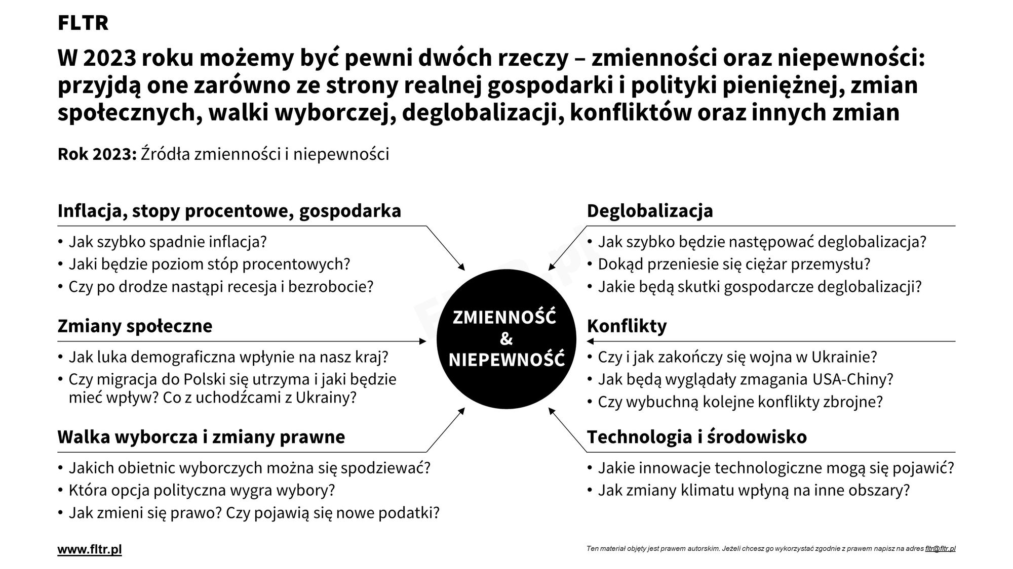 Skąd w 2023 roku weźmie się owa zmienność i niepewność? Z co najmniej 6 źródeł: niepewności co do warunków makroekonomicznych (skutków walki z inflacją, decyzji polityki pieniężnej, rozwoju aktywności gospodarczej w trakcie spowolnienia), zmian społecznych (luka demograficzna vs. migracja), efektów walki wyborczej (2023 to rok wyborów w Polsce), ale też przyspieszonej wydarzeniami lat 2020-22 roku deglobalizacji, nasilania się konfliktów, czy też nieustannych zmian technologicznych i środowiskowych. Każdy z nich możecie zresztą wykorzystać do samodzielnej analizy otoczenia 2023 roku na Waszą działalność.