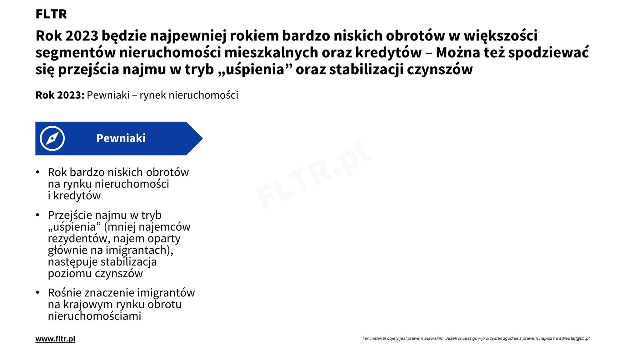 - Pewniaki - rynek nieruchomości: W 2023 roku spodziewamy się utrzymania bardzo niskiego obrotu na rynku nieruchomości i kredytów rzutującego na cały kształt rynku. Aktywność na rynku najmu będzie również mniejsza, nie mniej niska podaż ofert najmu powinna zapewnić stabilizację czynszów. Oczekujemy też istotnego wzrostu znaczenia imigrantów na rynku obrotu nieruchomości