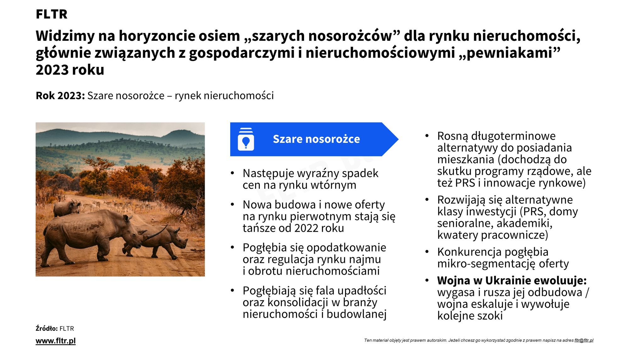 - Szare nosorożce - rynek nieruchomości: Wśród "szarych nosorożców" rynku nieruchomości upatrujemy takie procesy jak: wyraźny spadek cen w części segmentów rynku wtórnego, spadek kosztów budowy poniżej poziomów z 2022 r., pogłębienie opodatkowania i regulacji sektora nieruchomości, pogłębienie fali upadłości, ale i też akwizycji w sektorze, rozwój długoterminowych alternatyw do posiadania mieszkania, rozwój alternatywnych klas inwestycji, pogłębienie mikro-segmentacji przez konkurencję na rynku i kolejne zmiany rynkowe płynące z ewolucji wojny w Ukrainie