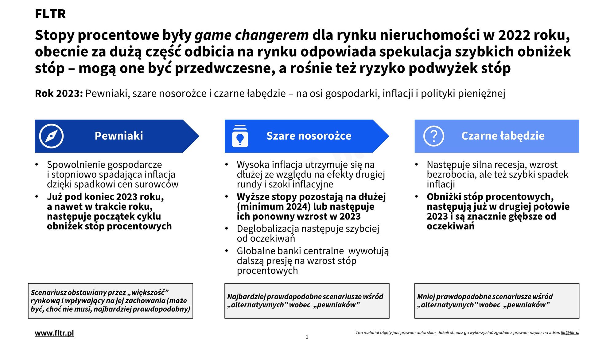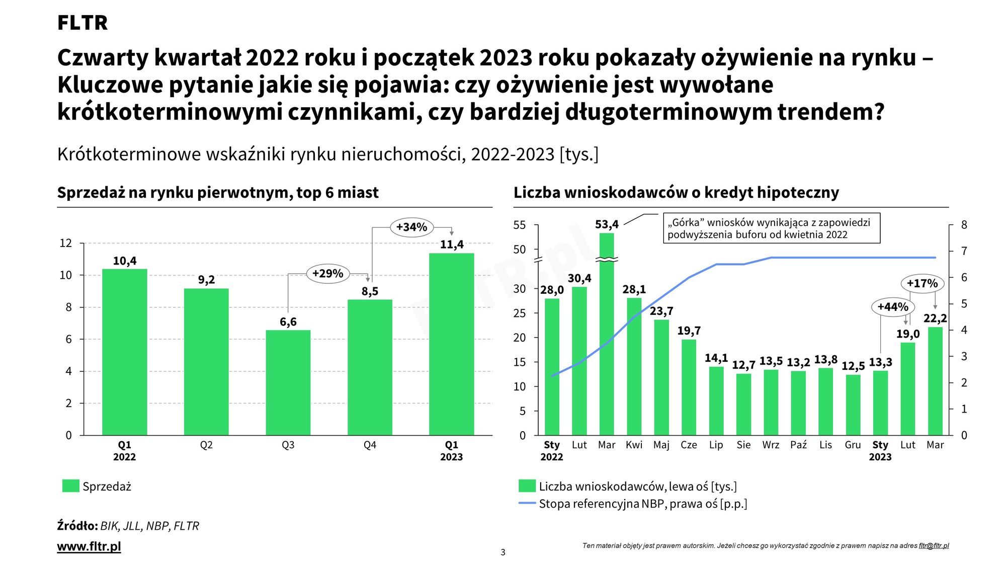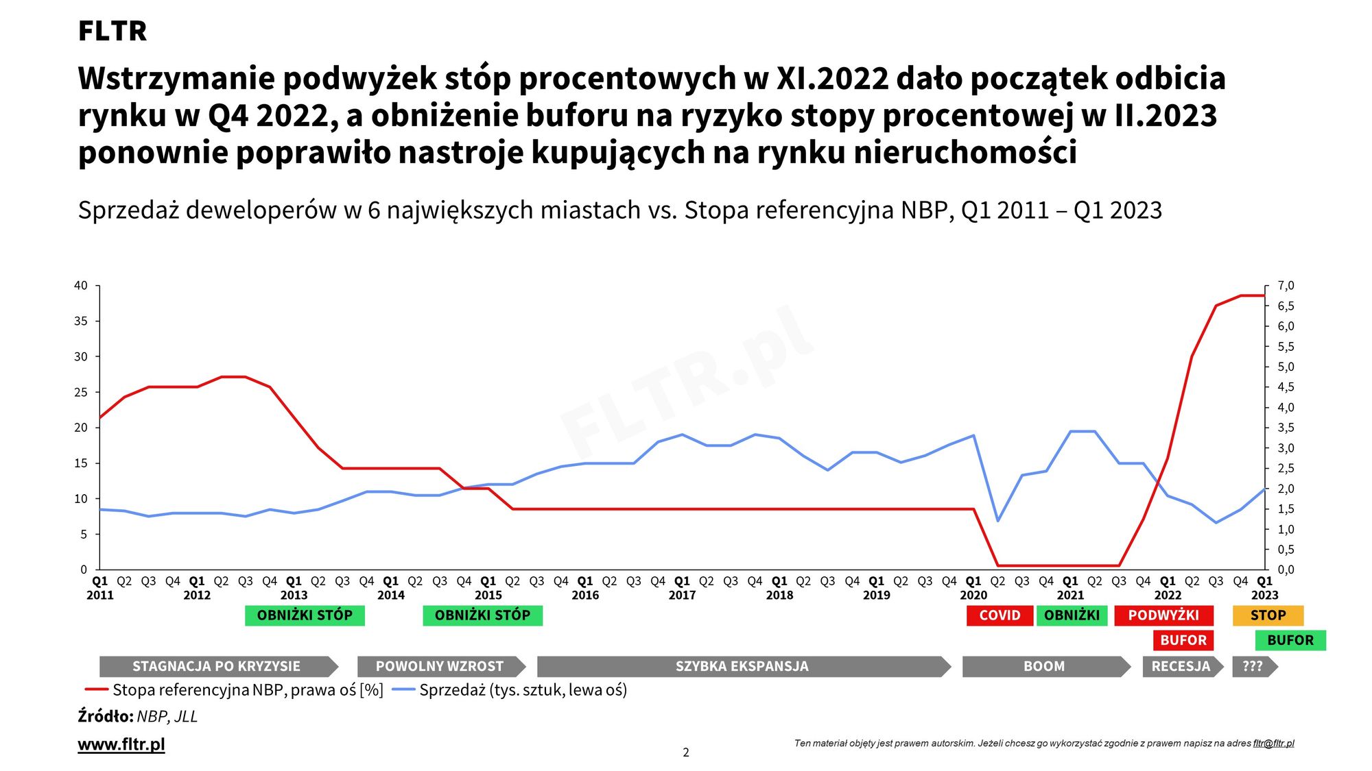 Wzrost stóp procentowych był game changerem dla rynku nieruchomości w 2022 roku, skutkując spadkiem sprzedaży kredytów hipotecznych o ok. 50% i zbliżonym wyhamowaniem sprzedaży na rynku pierwotnym i wtórnym. Z niszowego tematu dla ekonomistów tematyka stóp procentowych przeszła do mainstreamu dla konsumentów. Od października 2022 - wraz z zatrzymaniem cyklu podwyżek - ruszyło odbicie obrotu na rynku pierwotnym i wtórnym. Obecnie przyspiesza ono ze względu na zmiany w rekomendacjach KNF z lutego 2023 i zapowiedzi programu "Bezpieczny Kredyt 2%" z początku 2023 roku, ale nadal za dużą część odbicia zwłaszcza ze strony inwestorów (którzy aktualnie dominują na rynku) odpowiada spekulacja szybkich obniżek stóp w otoczeniu nadal wysokiej inflacji.