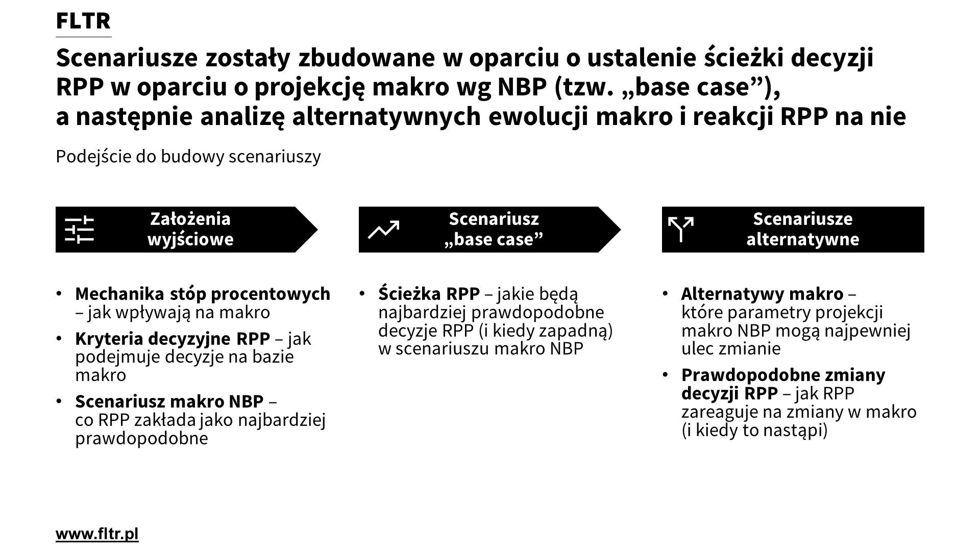 - Analiza scenariuszy została oparta na budowie scenariusza "base case" (najbardziej prawdopodobne zachowania RPP w oparciu o przebieg makro wg prognozy NBP - opisane w poprzednich artykułach serii) oraz analizy najbardziej prawdopodobnych scenariuszy alternatywnych (prawdopodobne odchylenia od makro i możliwe odpowiedzi RPP)